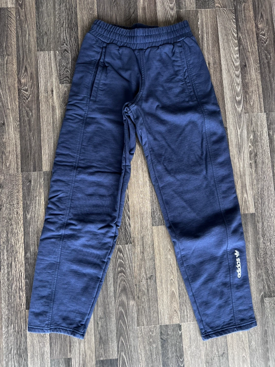 These Adidas sweatpants are navy blue and feature snap buttons down the side seams. They're a size S. Comfortable for lounging or activewear!