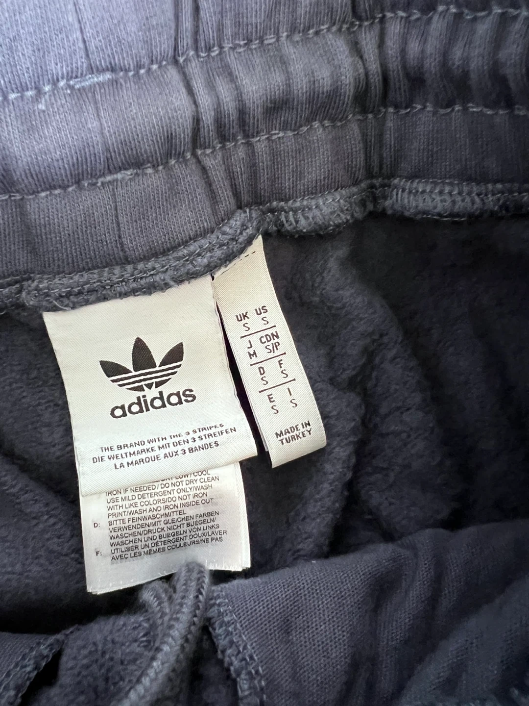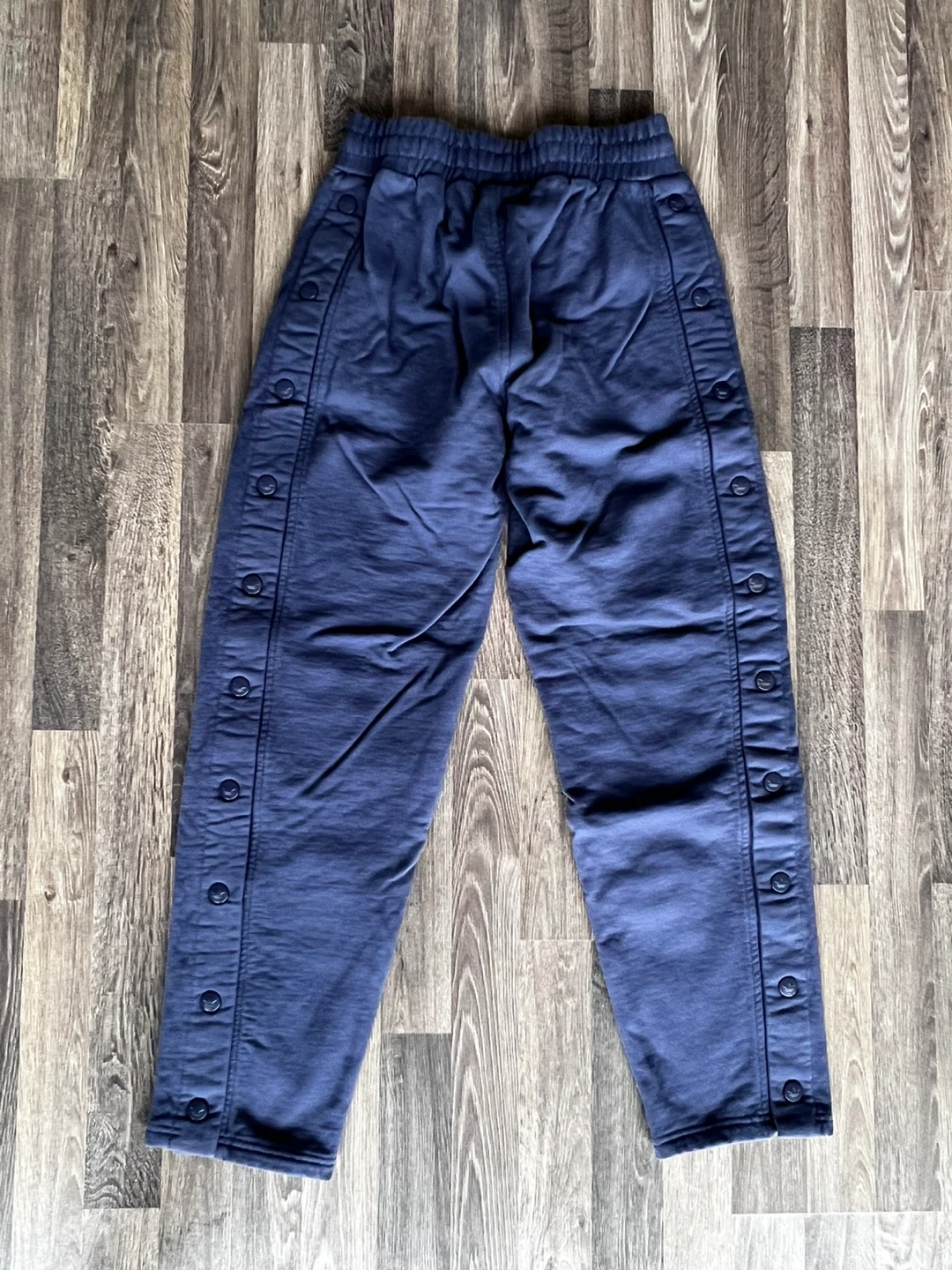These Adidas sweatpants are navy blue and feature snap buttons down the side seams. They're a size S. Comfortable for lounging or activewear!