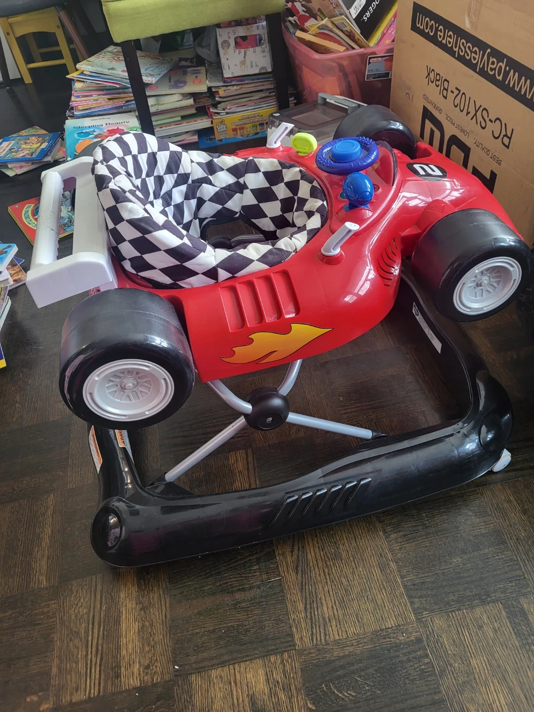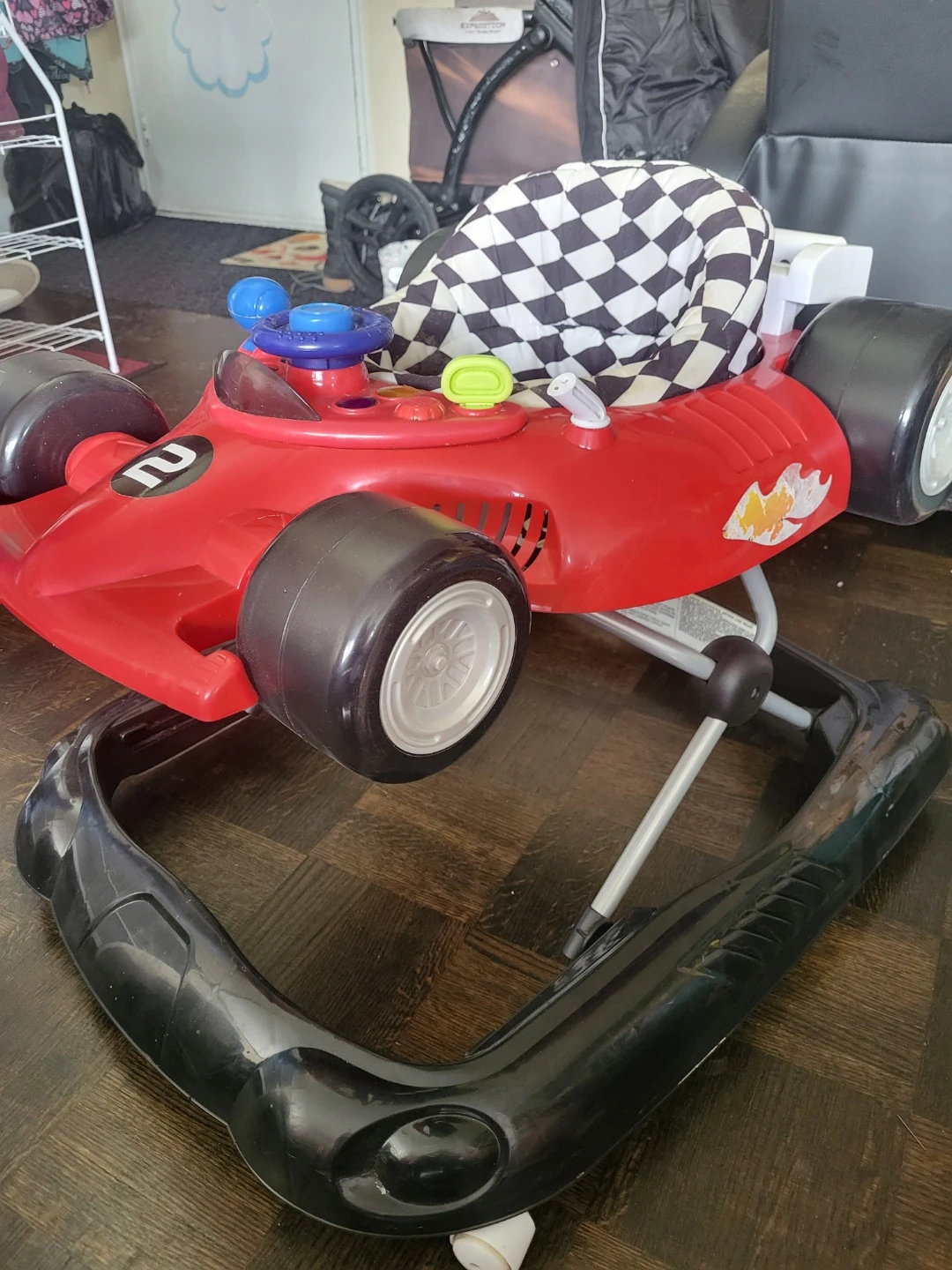 This baby walker is designed like a red race car. It features a checkered fabric seat and interactive toys on the dashboard. It's great for little ones learning to move around!