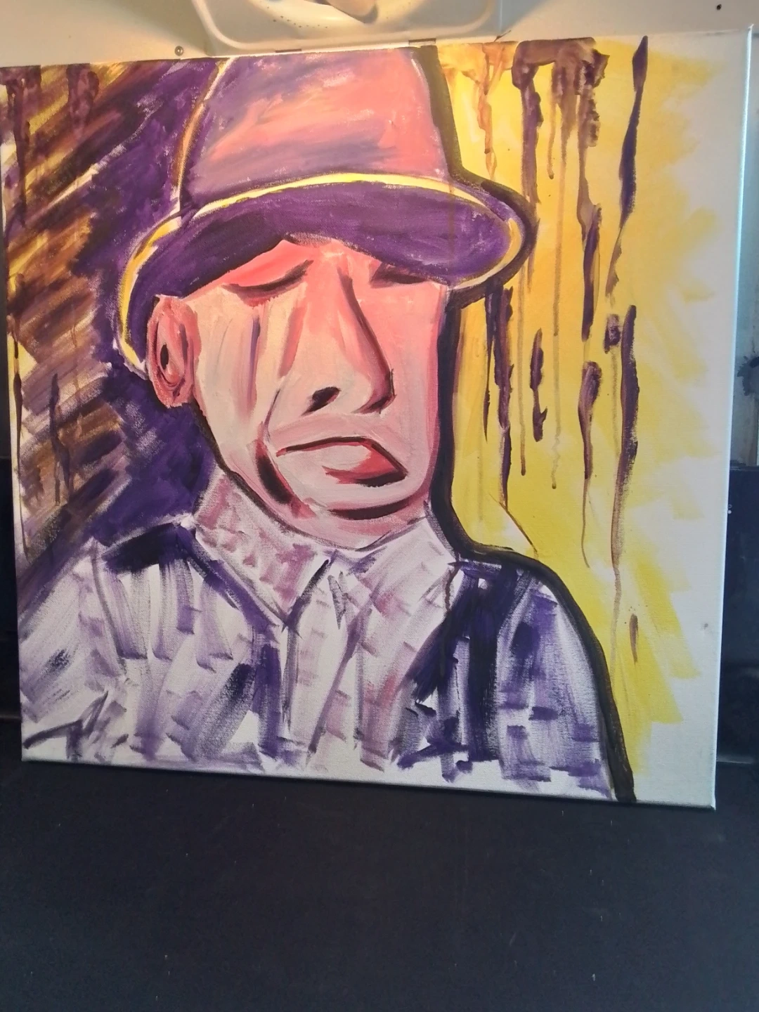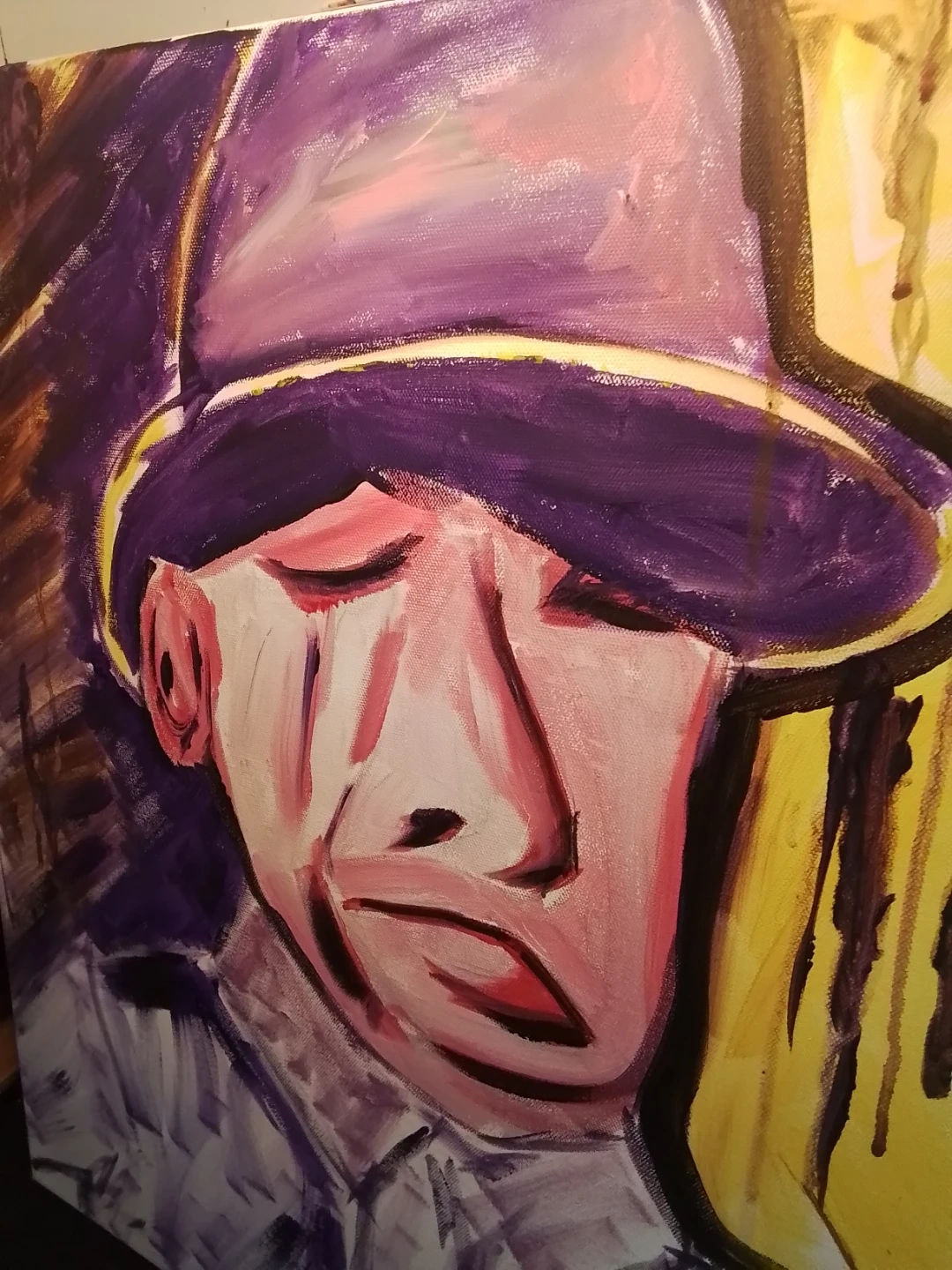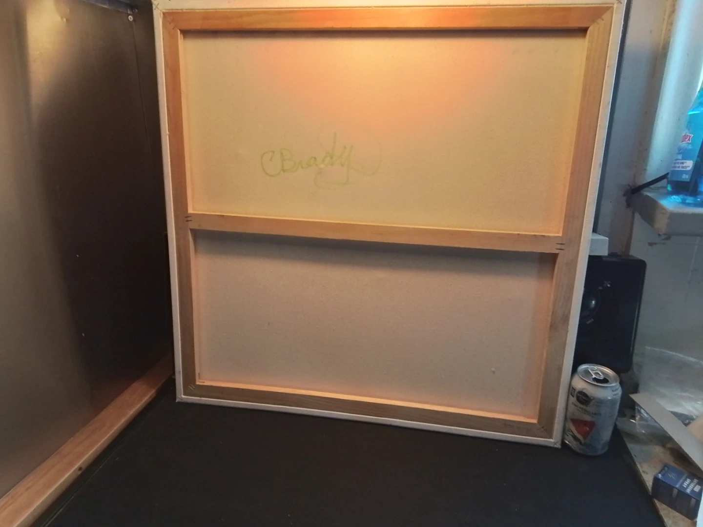 This used painting is a signed original acrylic on board by Niagara artist Cathy Brady. The work measures 24x24 inches and features a unique, expressive style. It's a pre-owned piece with the artist's signature prominently displayed. This piece offers a distinctive touch to any art collection.