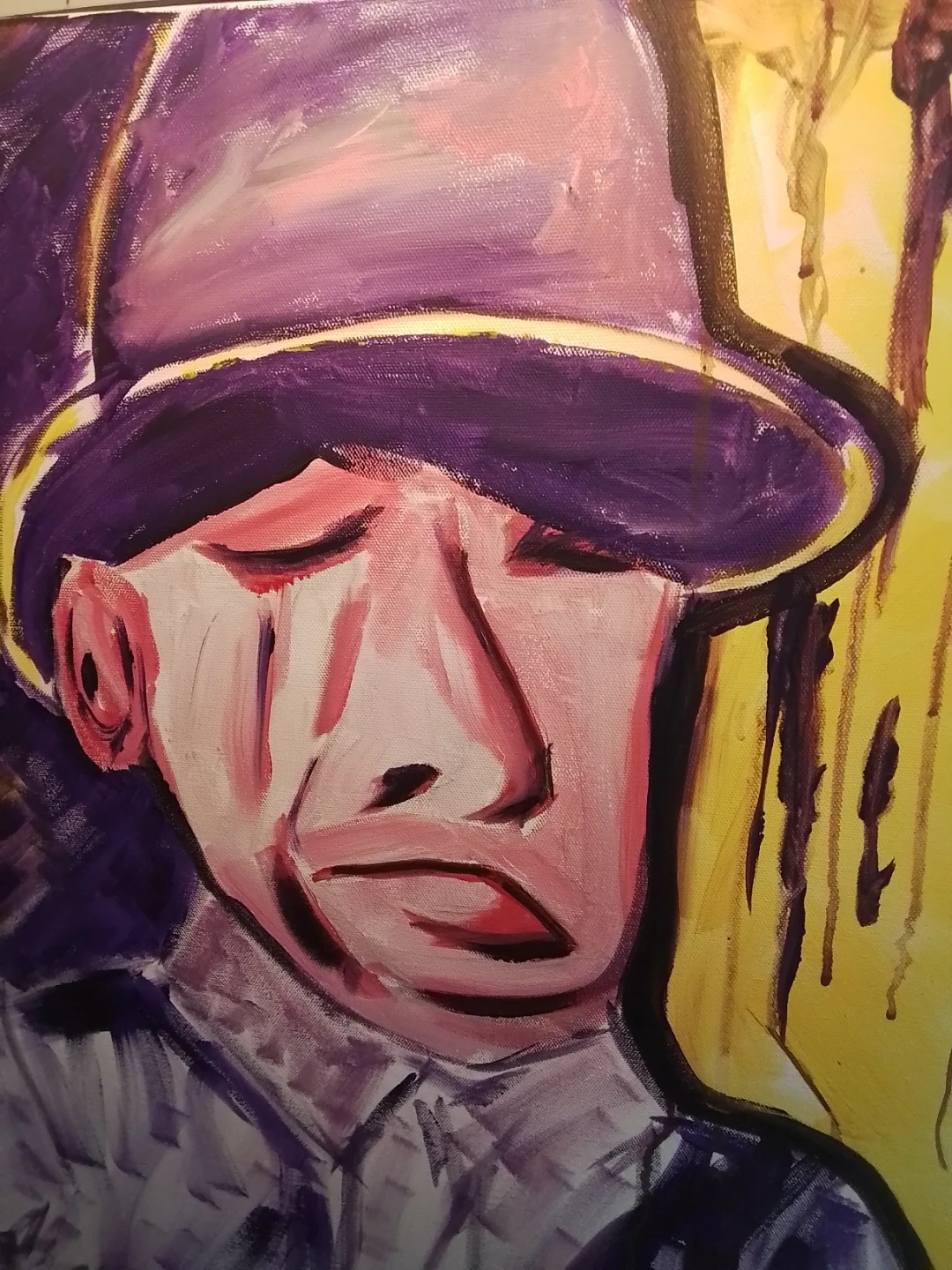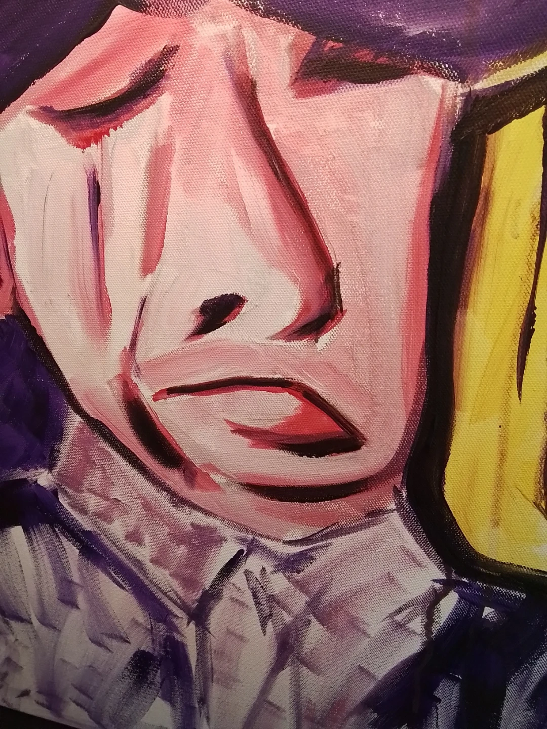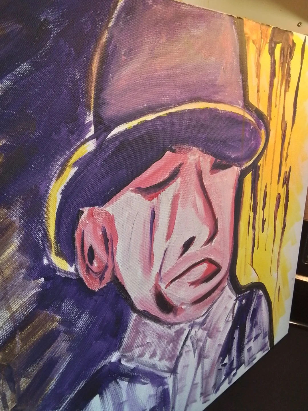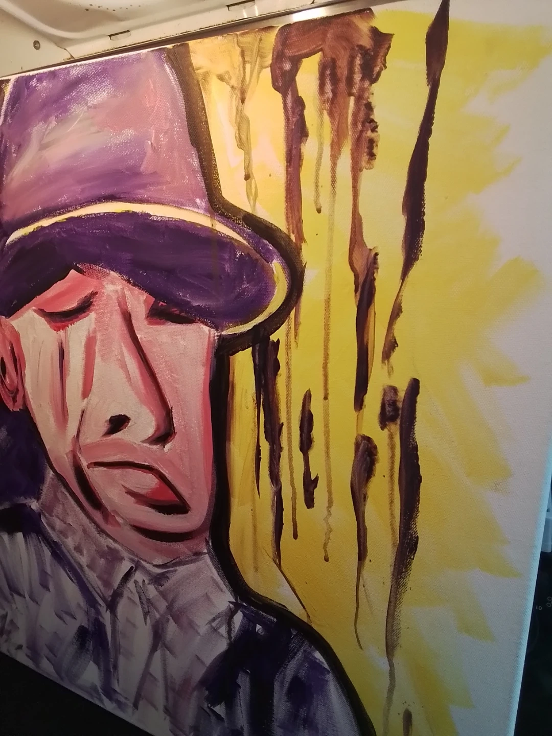 This used painting is a signed original acrylic on board by Niagara artist Cathy Brady. The work measures 24x24 inches and features a unique, expressive style. It's a pre-owned piece with the artist's signature prominently displayed. This piece offers a distinctive touch to any art collection.
