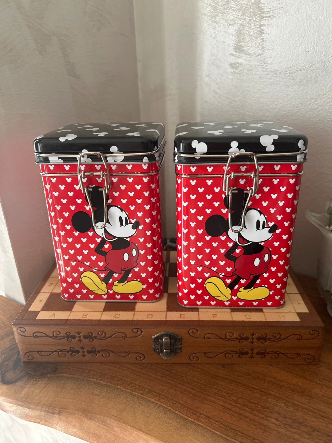Here's a set of two adorable Mickey Mouse themed storage tins! They feature a red and white Mickey Mouse pattern on the sides and a black and white Mickey Mouse pattern on the lid. Great for adding a touch of Disney magic to your kitchen or any room!