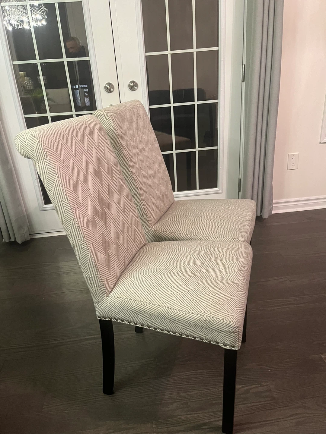 Two upholstered dining chairs with a textured geometric pattern fabric. They feature dark wooden legs and decorative nailhead trim along the edges. Perfect for adding a stylish touch to your dining room!
