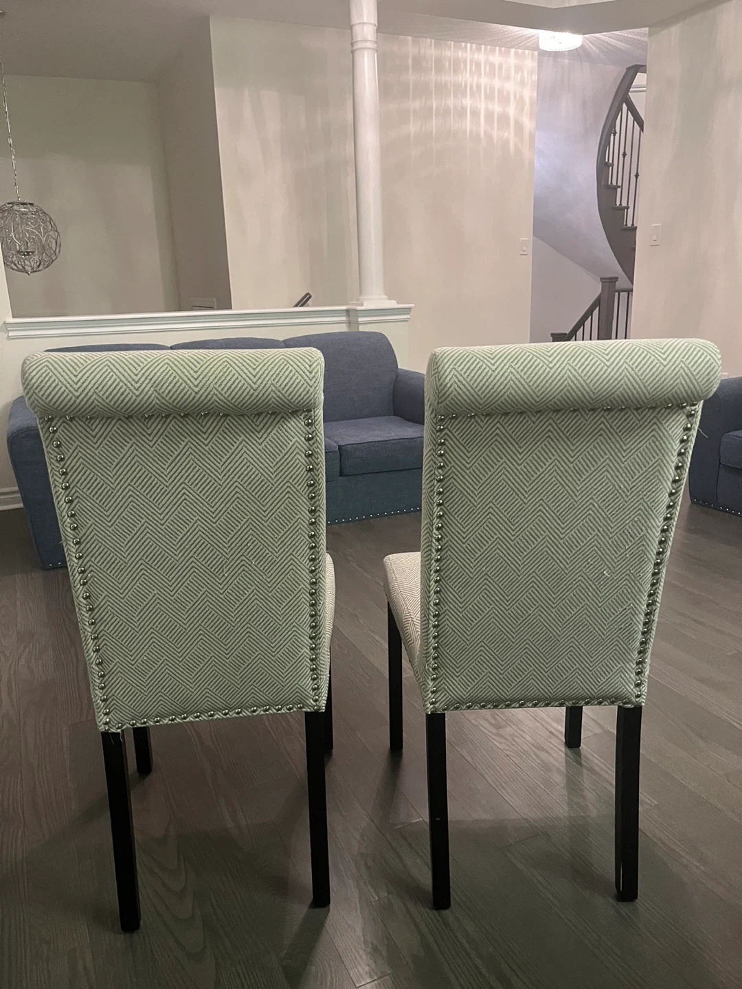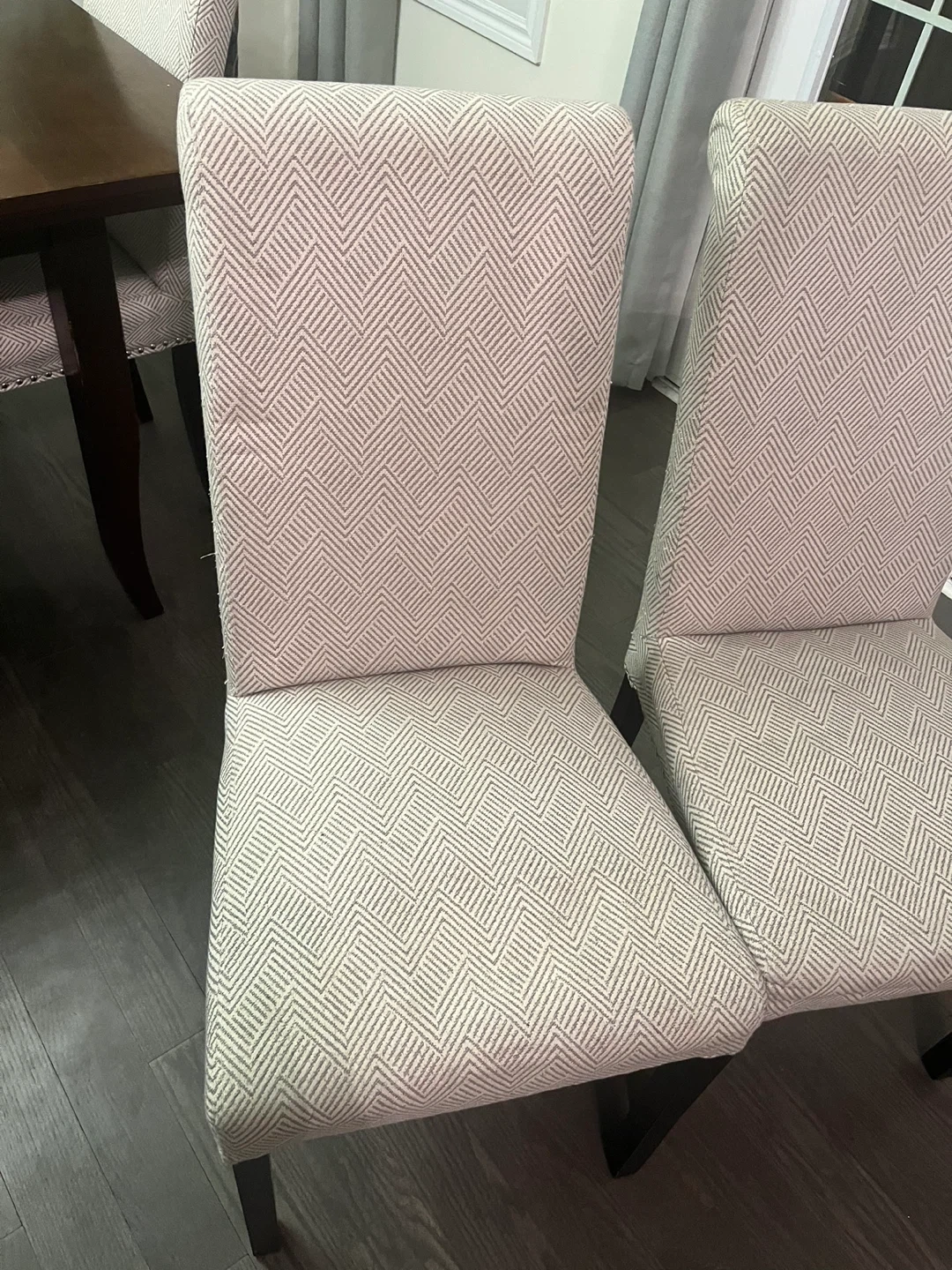 Two upholstered dining chairs with a textured geometric pattern fabric. They feature dark wooden legs and decorative nailhead trim along the edges. Perfect for adding a stylish touch to your dining room!