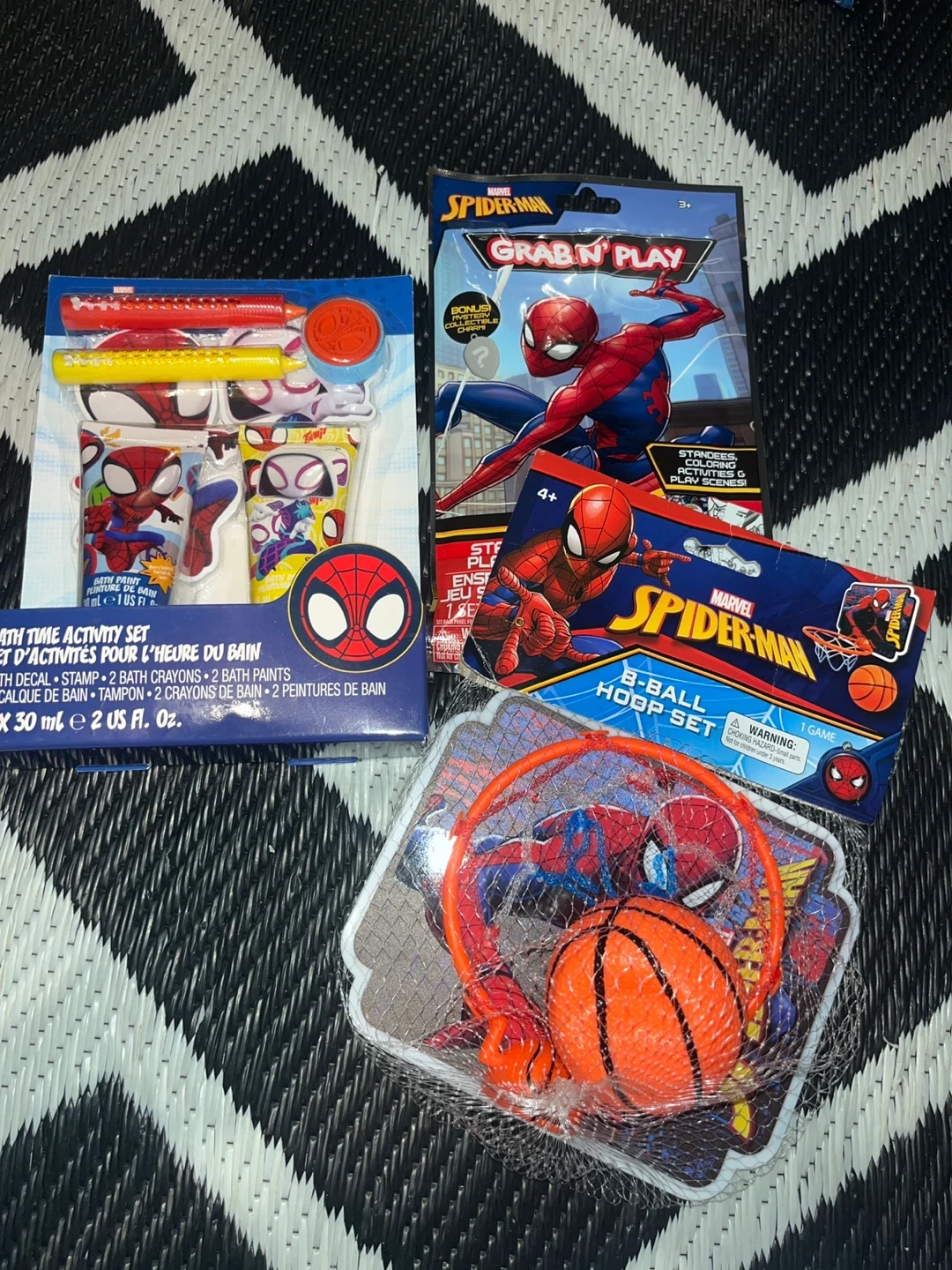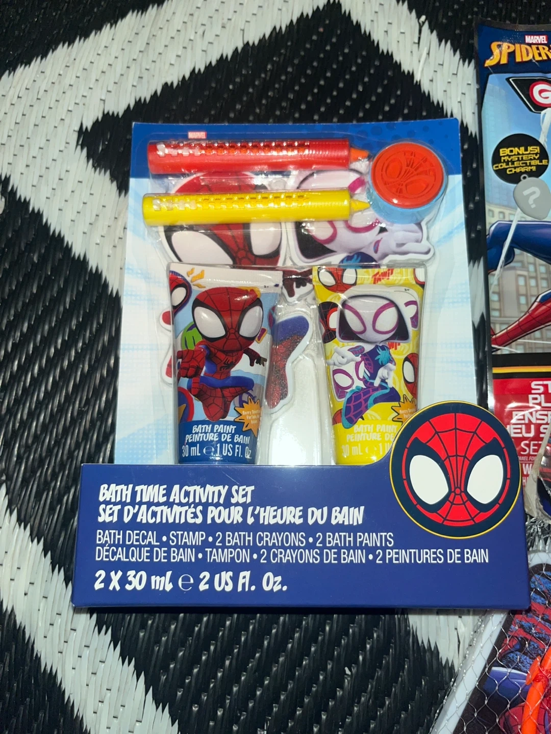 Includes a bath time activity set with 2 bath crayons, 2 bath paints, a stamp, and bath decals. Also features a Spiderman B-Ball Hoop Set with a mini basketball and hoop. Suitable for ages 4+.