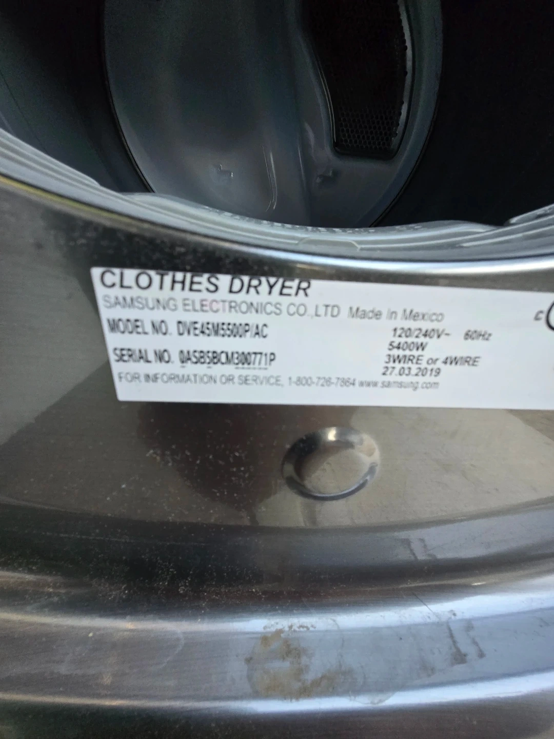 This is a used Samsung dryer, model DVE45M5500P/AC, designed to efficiently dry your clothes with its large capacity and multiple drying cycles.