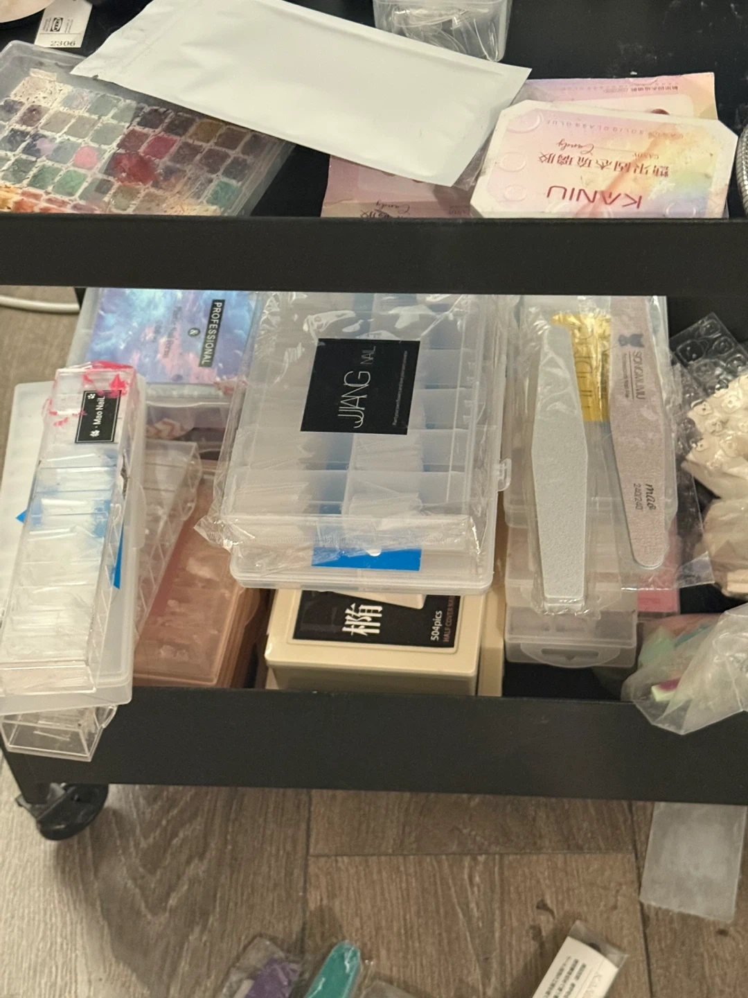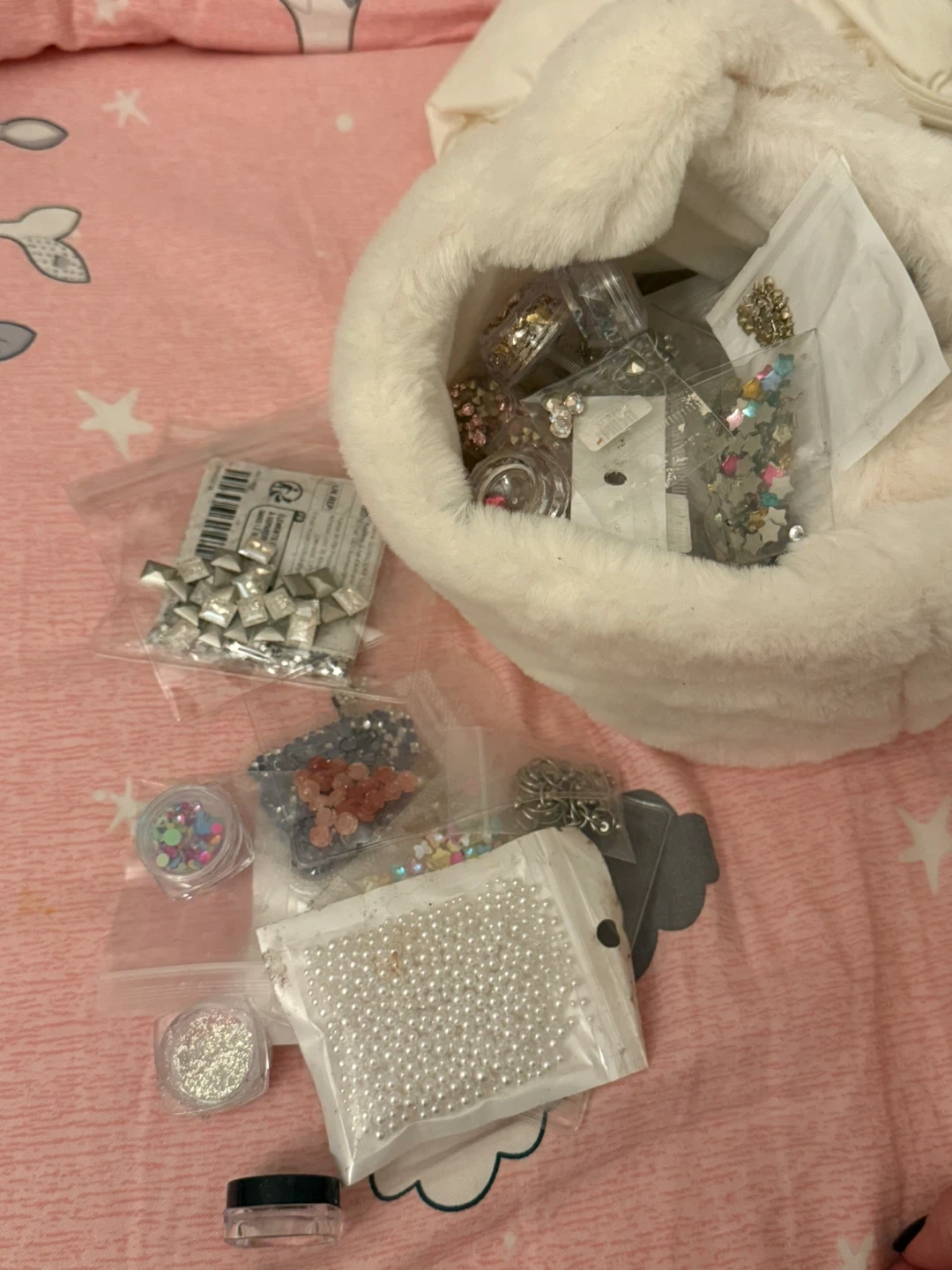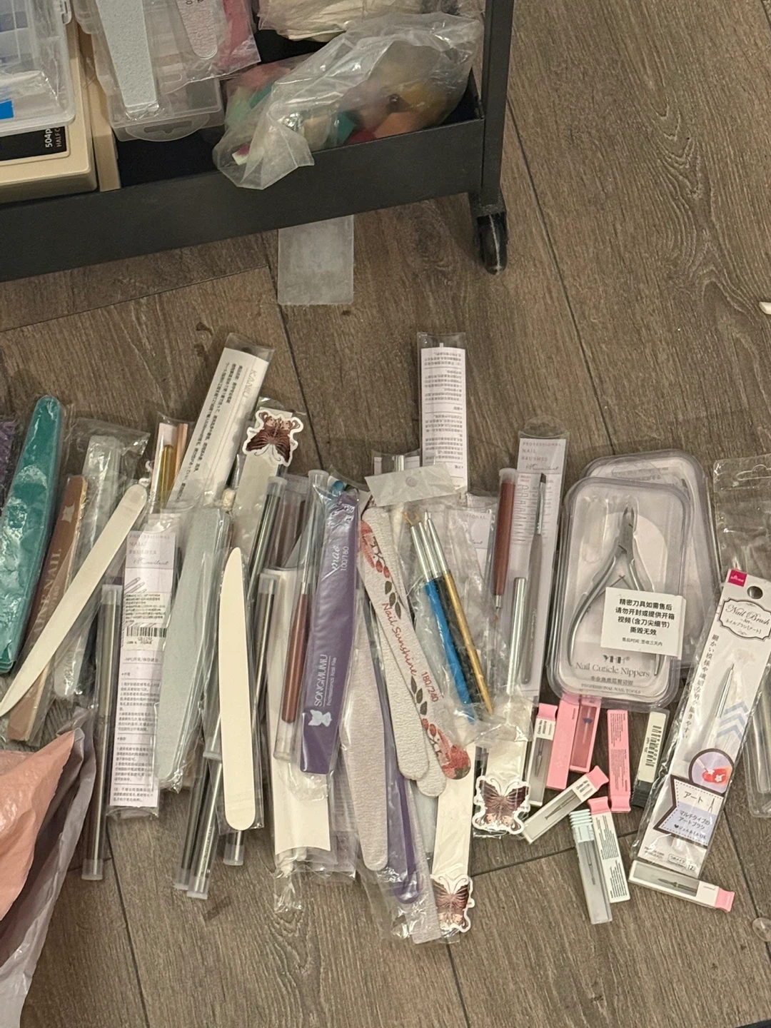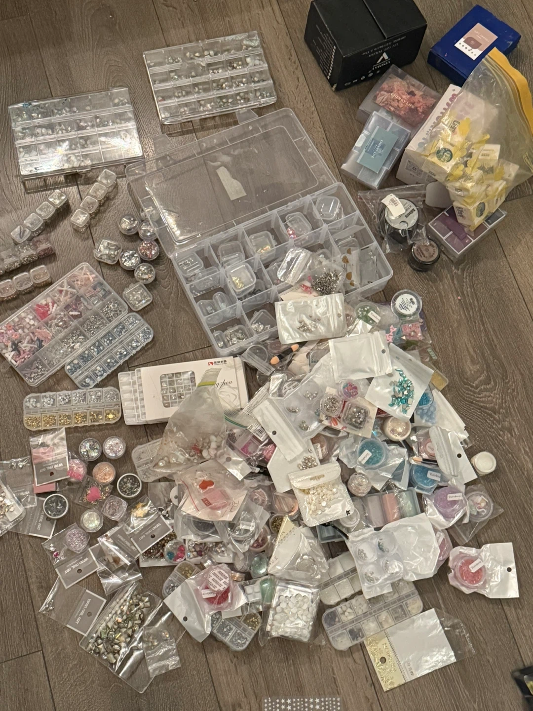 Large collection of nail art decorations including rhinestones, charms, glitter, and foils. Includes various gel polishes and tools like brushes, files, and clippers. Everything you need for professional or home manicures!