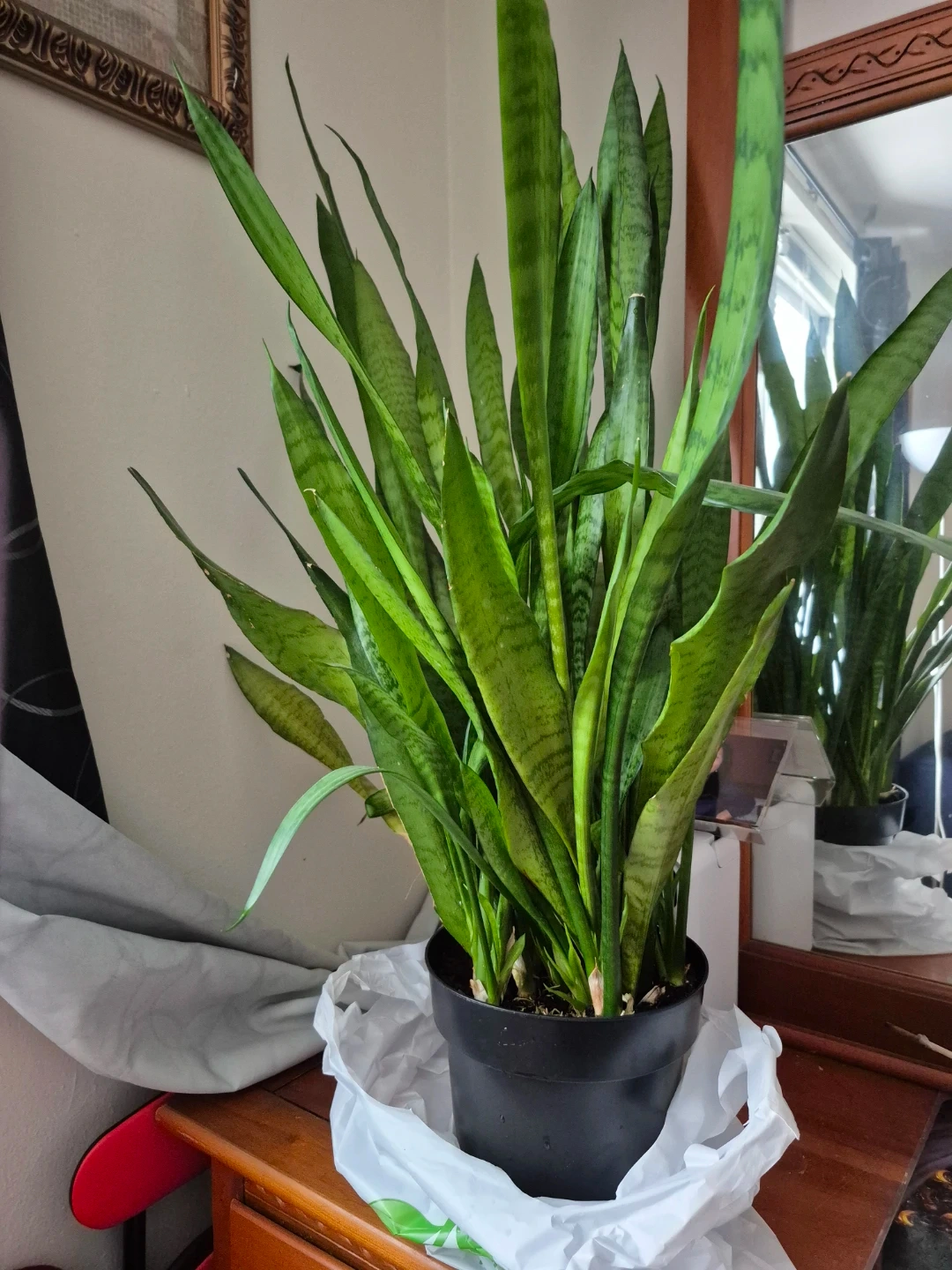 A healthy snake plant in a black plastic pot. Its stiff, upright leaves are a deep green with lighter banding. It's a low-maintenance plant that tolerates a variety of conditions.