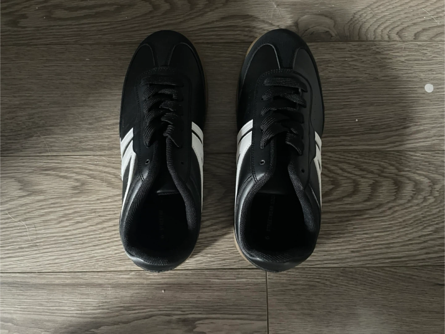 These are a pair of black sneakers with a white stripe on the side. They are in good condition and have a gum sole. Perfect for everyday wear! Pick up only