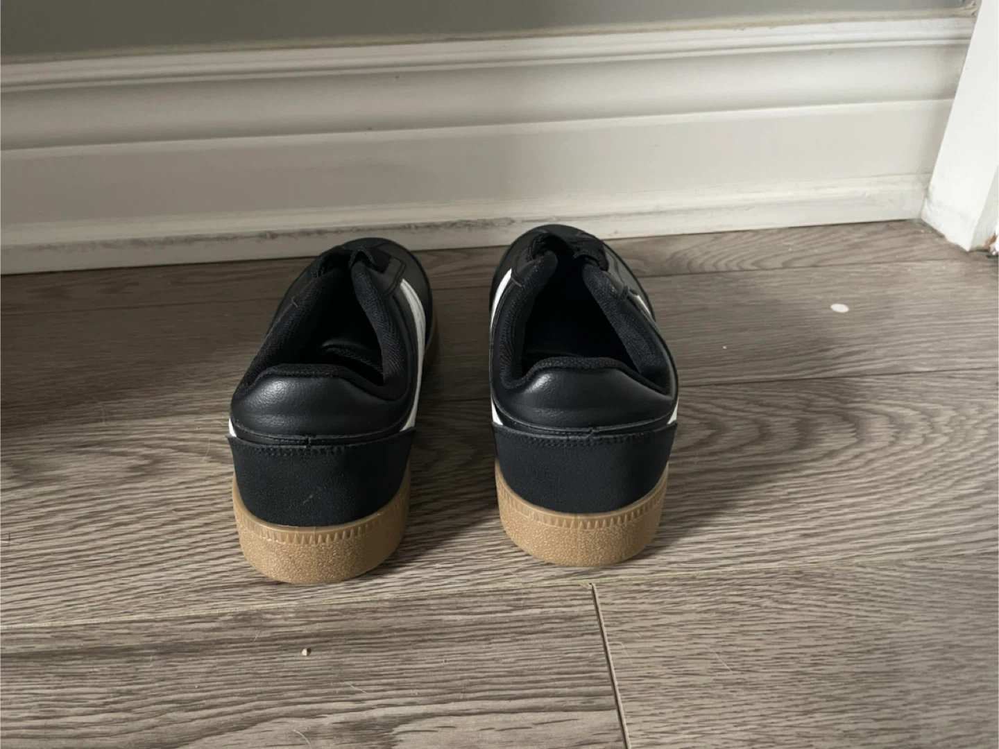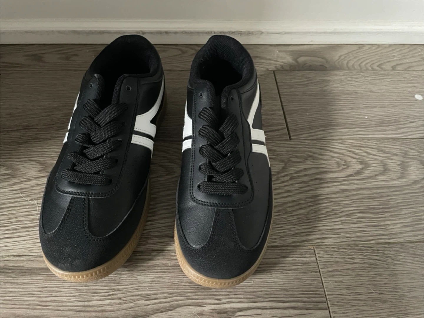 These are a pair of black sneakers with a white stripe on the side. They are in good condition and have a gum sole. Perfect for everyday wear! Pick up only
