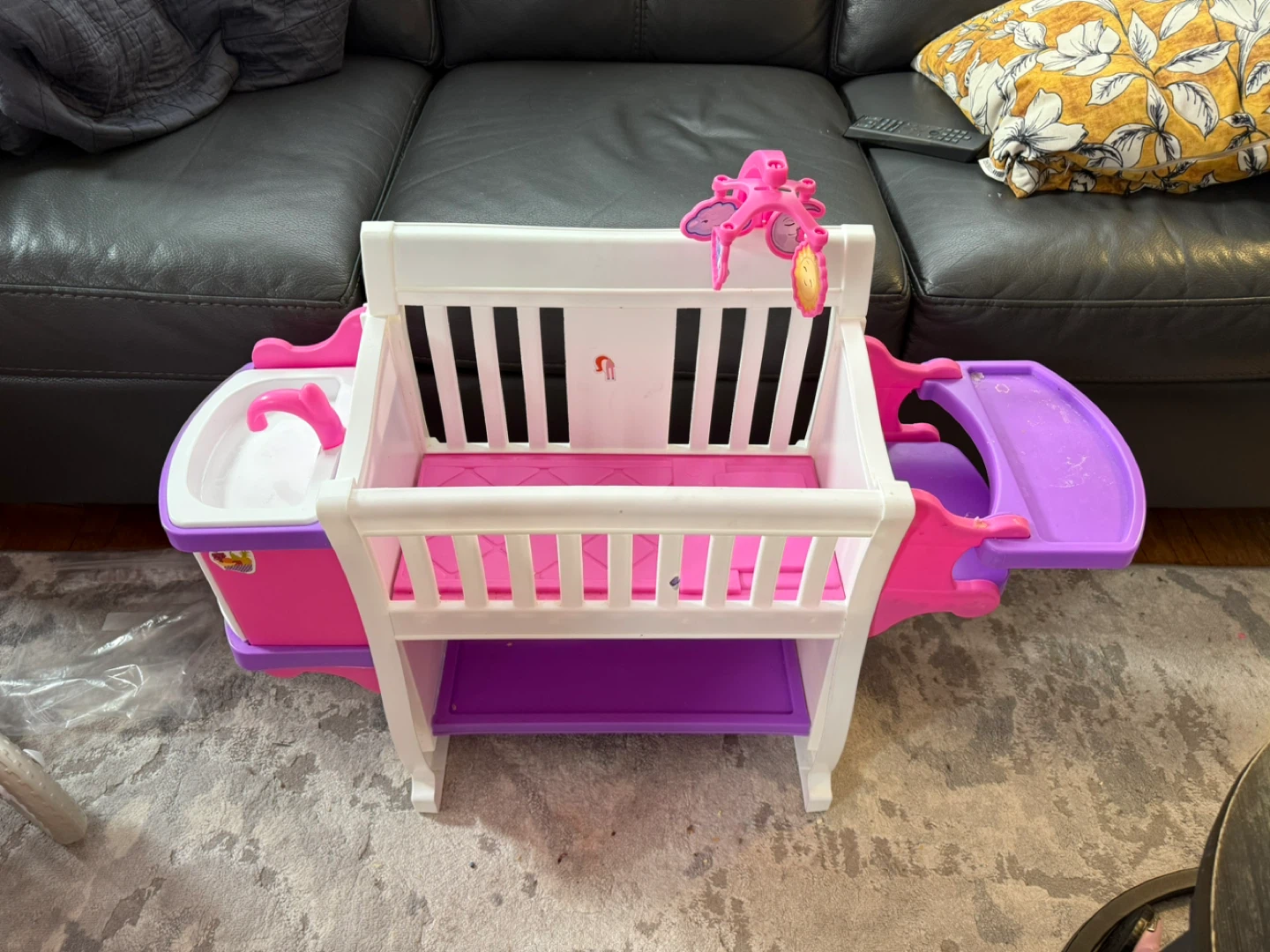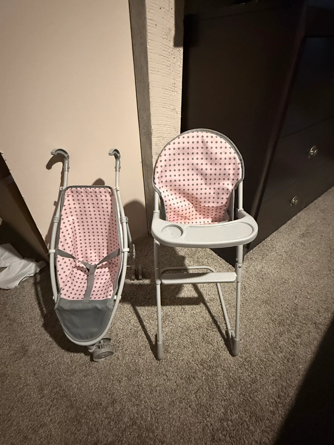 Selling a set of baby doll accessories! Includes a crib, stroller, high chair, and 2 carriers. Perfect for imaginative play and doll care! All in good condition. Willing to sell separately upon request. Pickup or delivery for a fee.