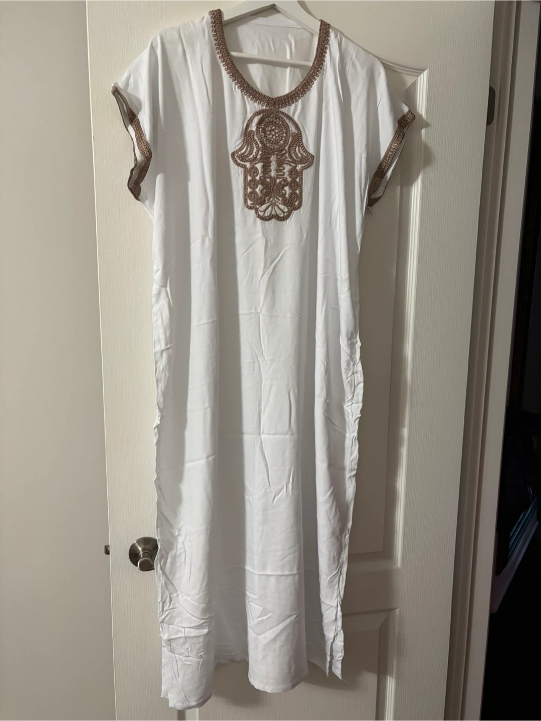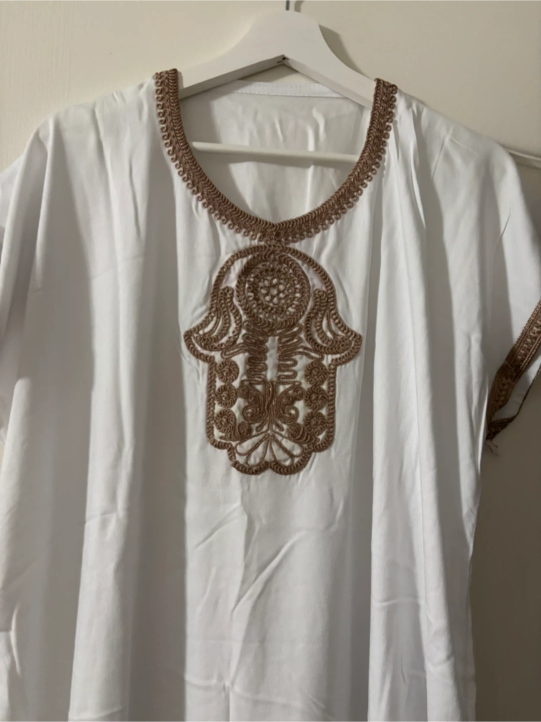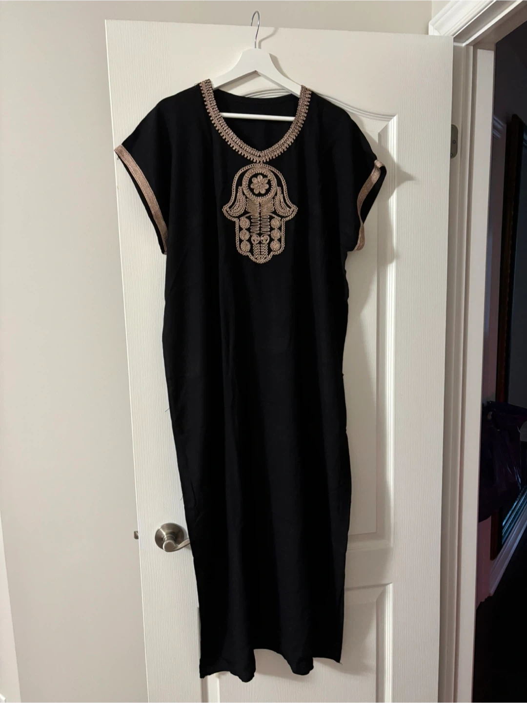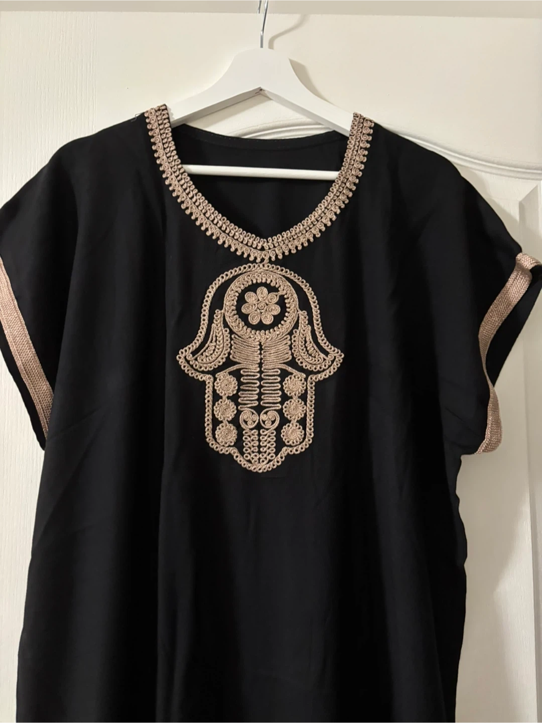 Two kaftan dresses, one black and one white, featuring intricate embroidered Hamsa hand designs on the front. The neckline and sleeve cuffs have decorative trim. Made from comfortable fabric, these dresses are perfect for casual wear or layering. Available in your choice of black or white!