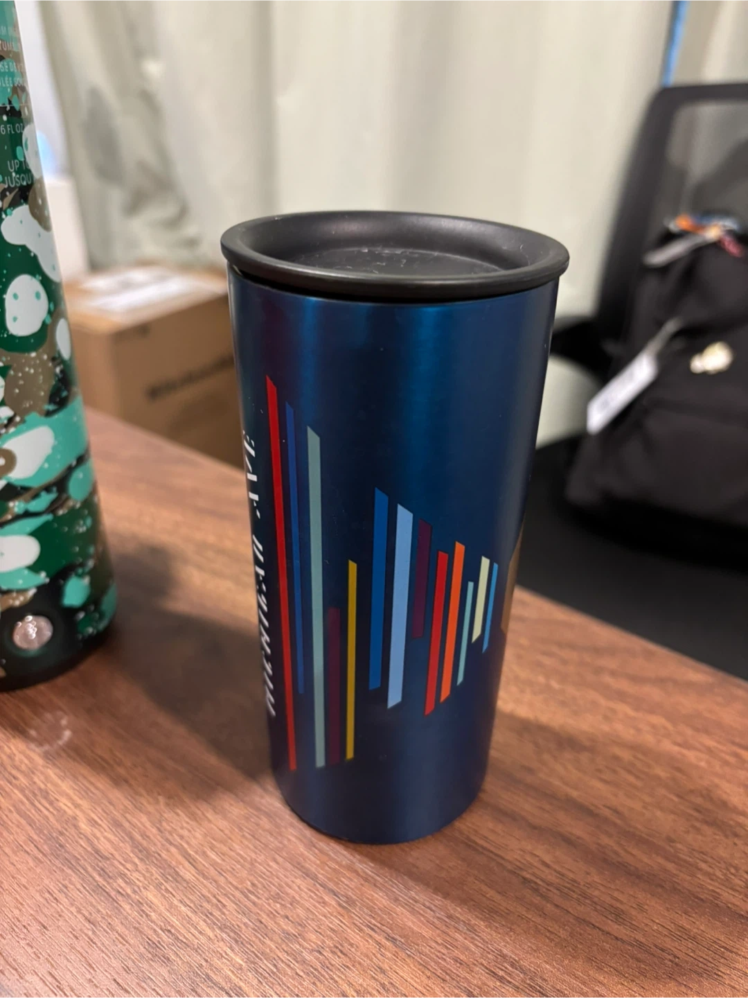 A reusable travel tumbler with a dark blue metallic finish. It features a colourful abstract stripe design. The lid is black and secure.