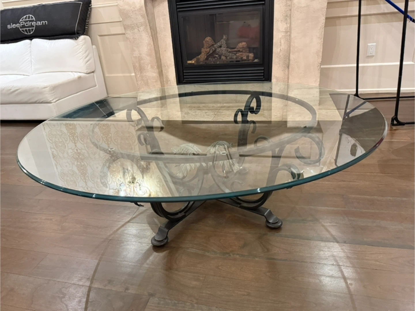 Round glass top coffee table with a decorative metal base. The metalwork features swirling details and a central ornate element. It's a nice size for a living room. This table adds an elegant touch to any space!