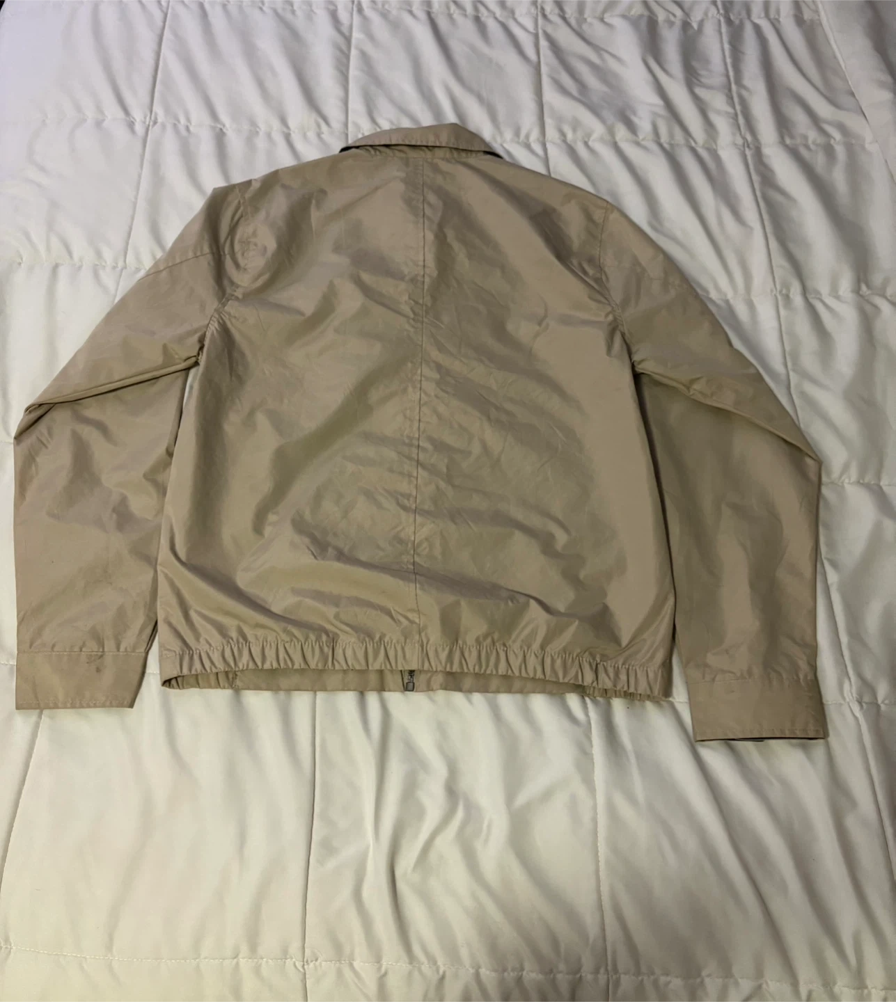 This U.S. Polo Assn. jacket is tan and size S. It's a lightweight option with a full zip front and a zippered chest pocket. The interior lining is dark navy.
