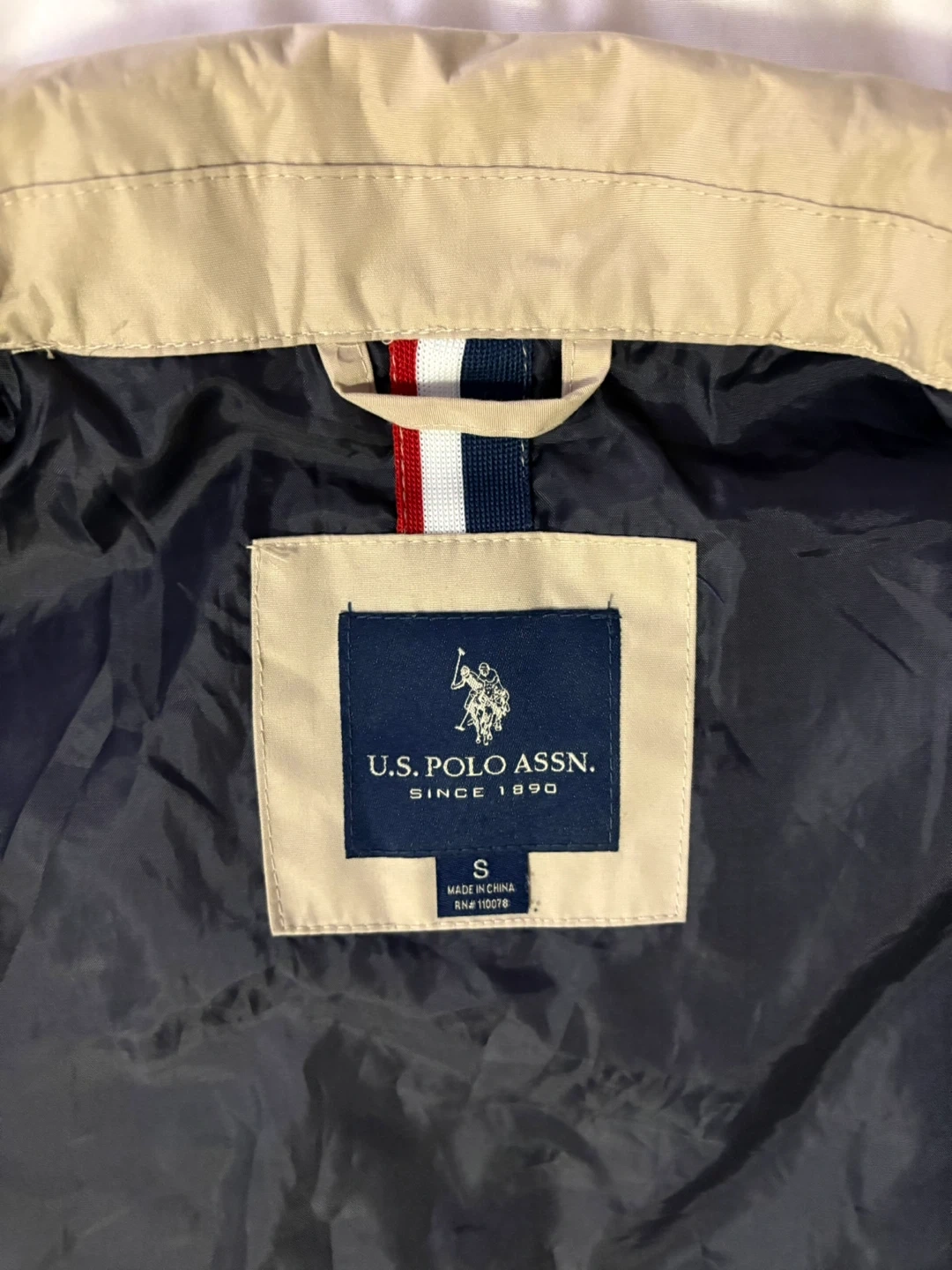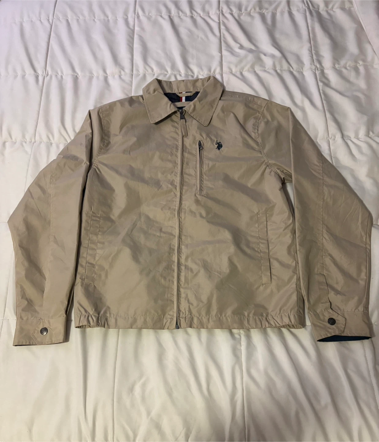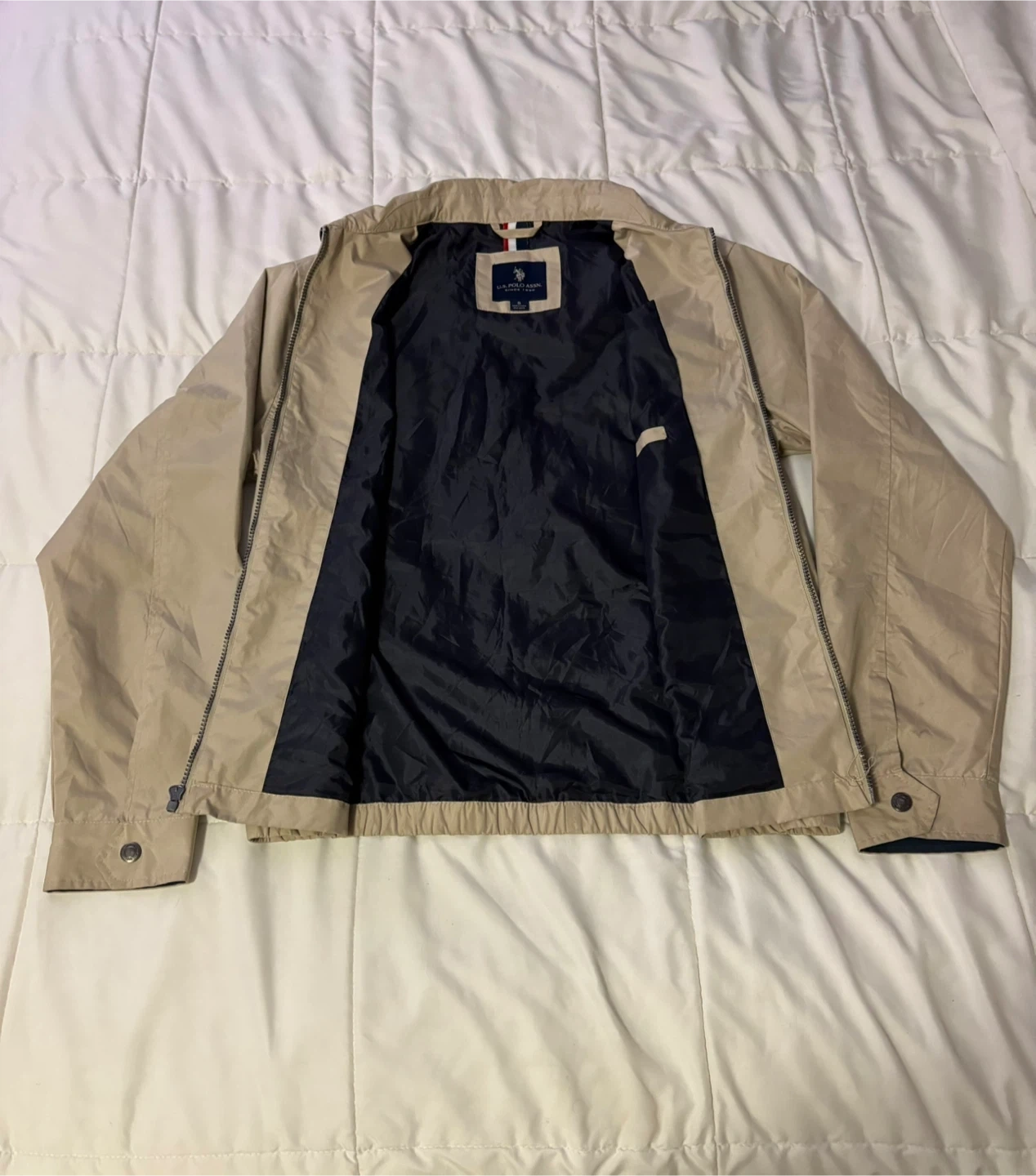 This U.S. Polo Assn. jacket is tan and size S. It's a lightweight option with a full zip front and a zippered chest pocket. The interior lining is dark navy.