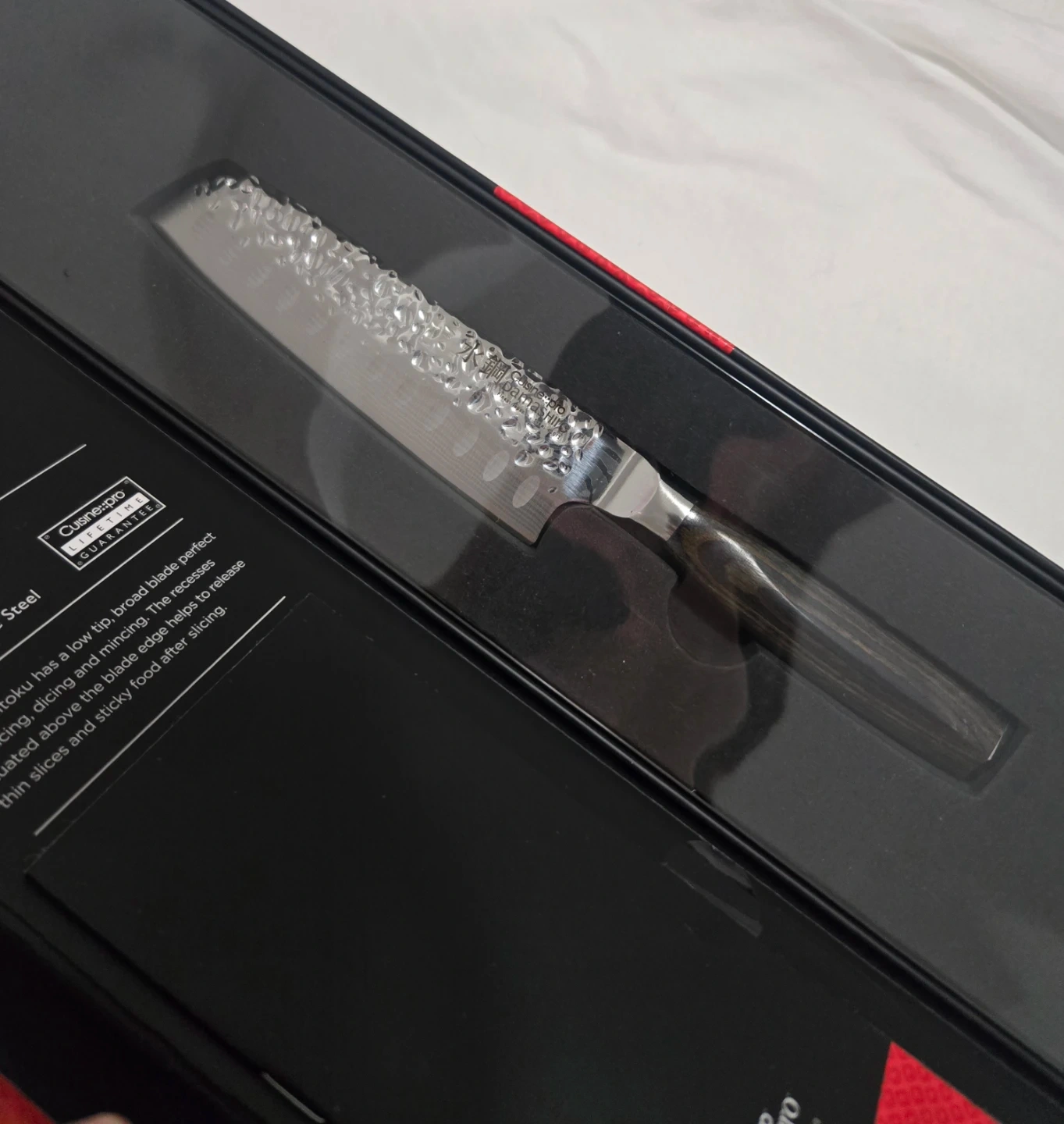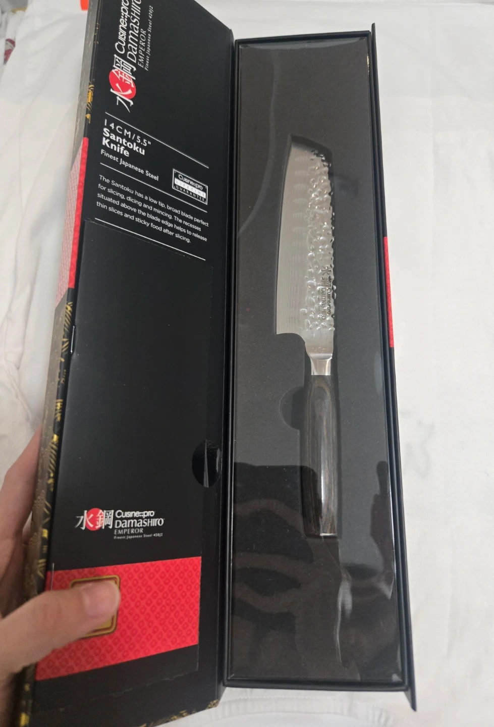 I'm selling a brand new Cuisine::pro Damashiro Emperor Santoku Knife! It's 14cm/5.5" and made with finest Japanese steel. The box is included. The Santoku has a low tip, broad blade perfect for slicing, dicing and mincing.