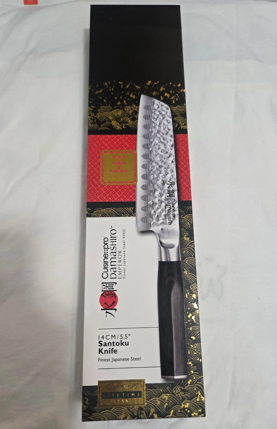 I'm selling a brand new Cuisine::pro Damashiro Emperor Santoku Knife! It's 14cm/5.5" and made with finest Japanese steel. The box is included. The Santoku has a low tip, broad blade perfect for slicing, dicing and mincing.