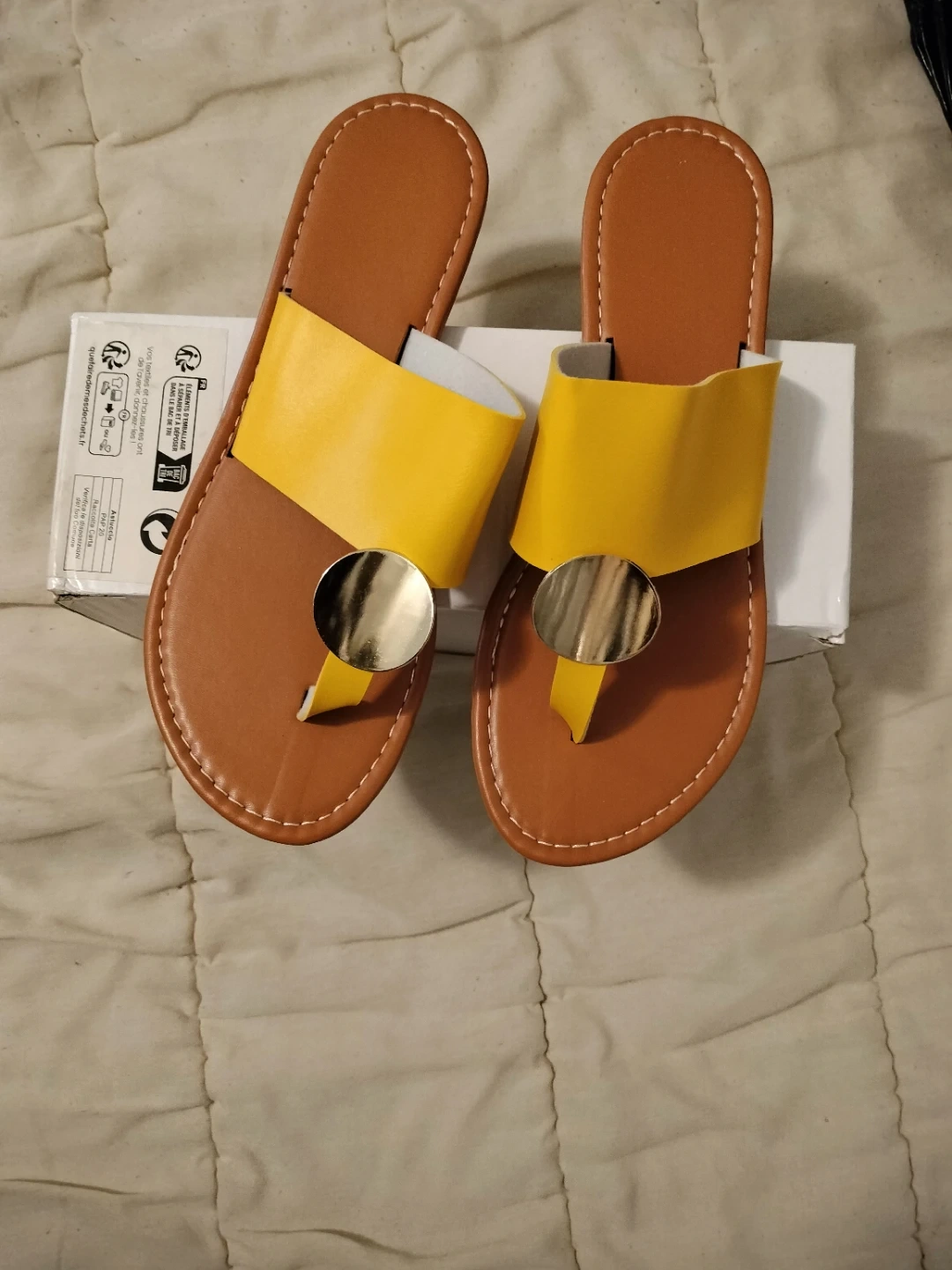 Comfortable thong sandals featuring a bright yellow strap with a stylish gold accent detail. The sole is a classic brown faux leather. These are perfect for casual wear in warmer weather!