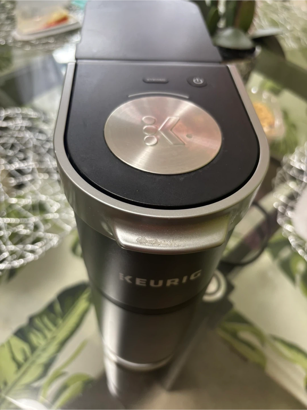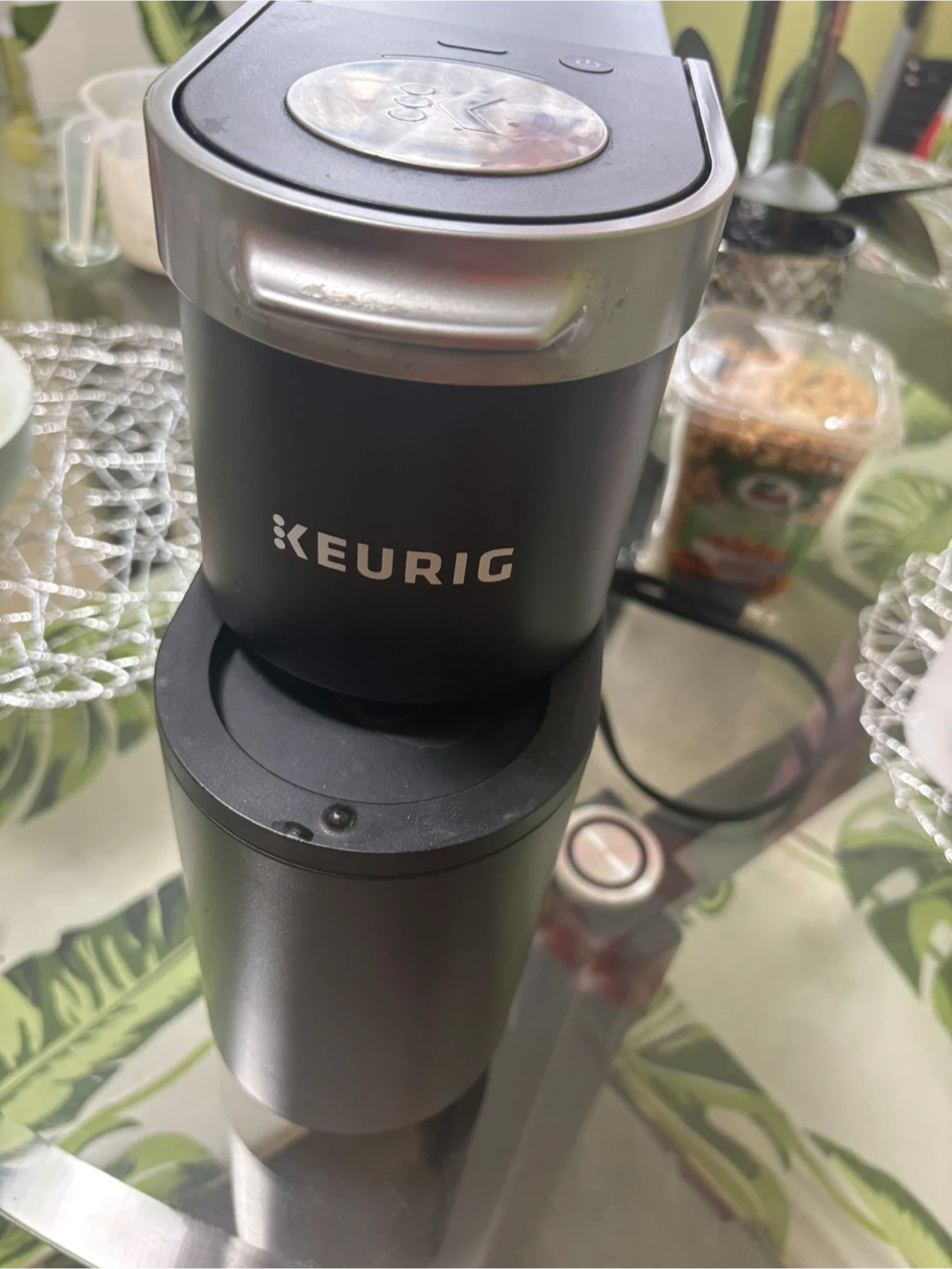 This is a Keurig coffee maker. It's black with silver accents. Features include a water level indicator and k-cup storage.