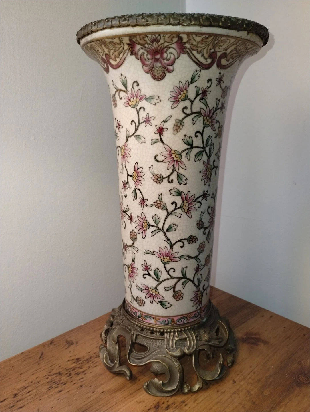Beautiful mid-century Chinese porcelain vase with gilt bronze mounts. Features a lovely floral pattern. This is a vintage original piece.
