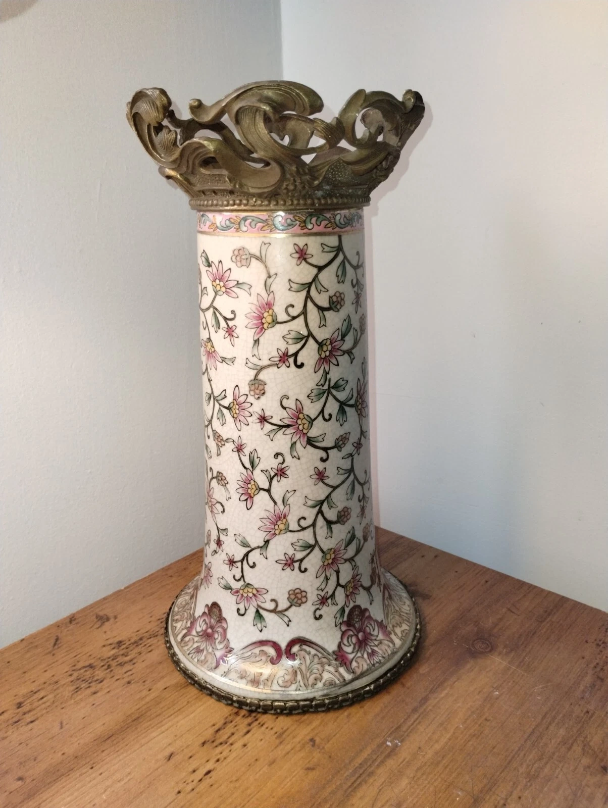 Beautiful mid-century Chinese porcelain vase with gilt bronze mounts. Features a lovely floral pattern. This is a vintage original piece.