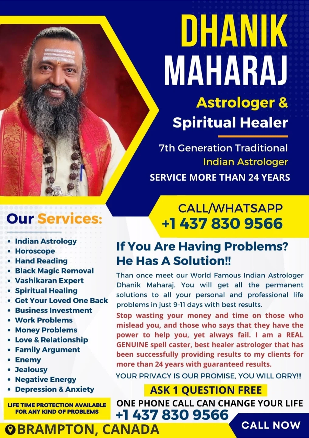 Dhanik Maharaj offers astrological and spiritual healing services. He provides solutions for personal and professional life problems within days. Your privacy is promised, and results are guaranteed.
