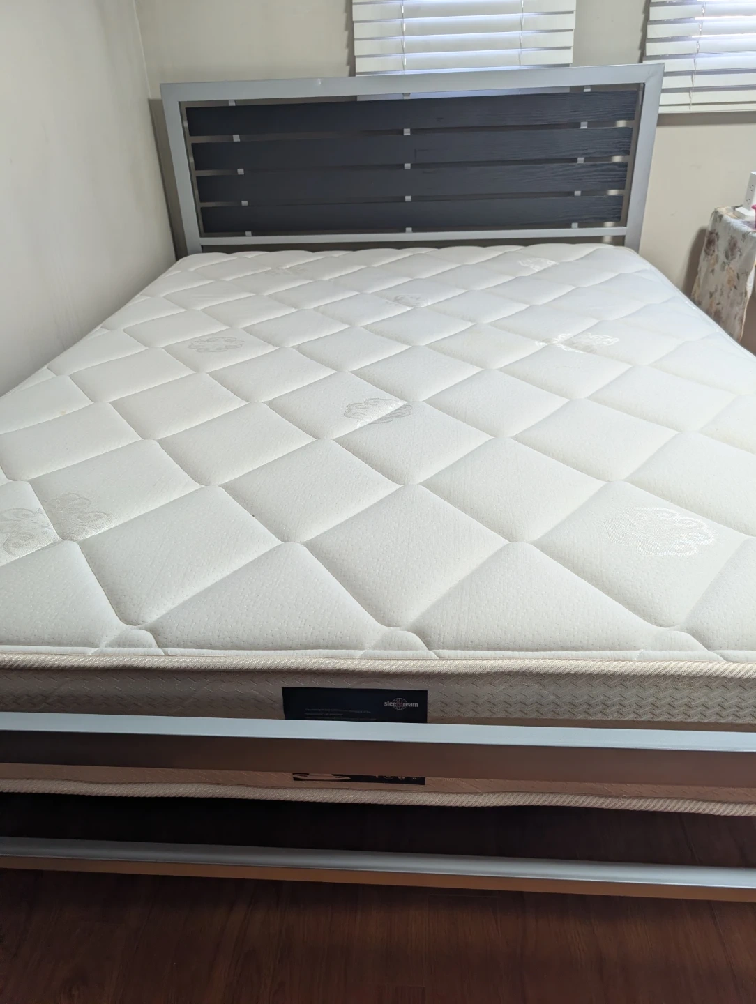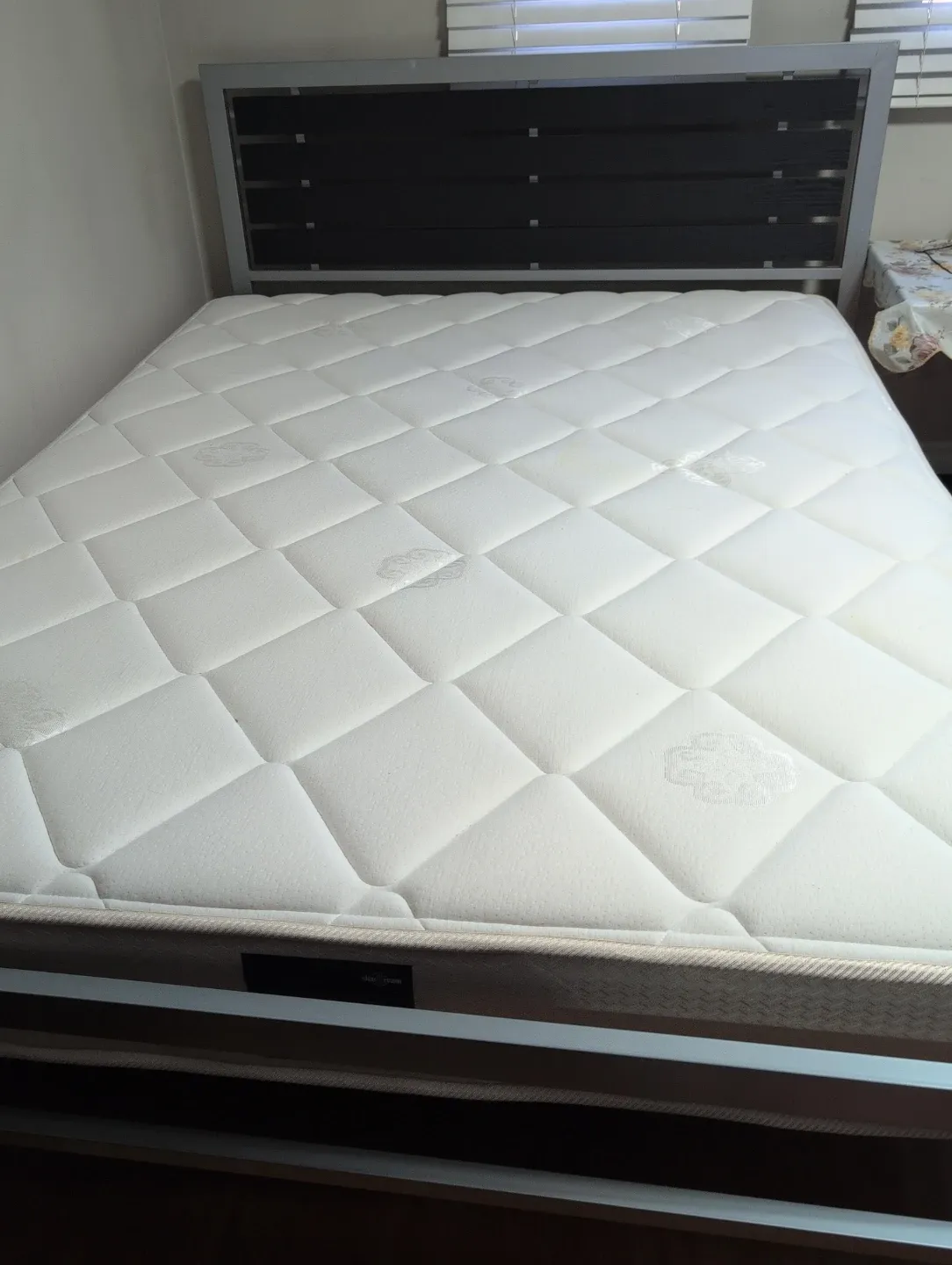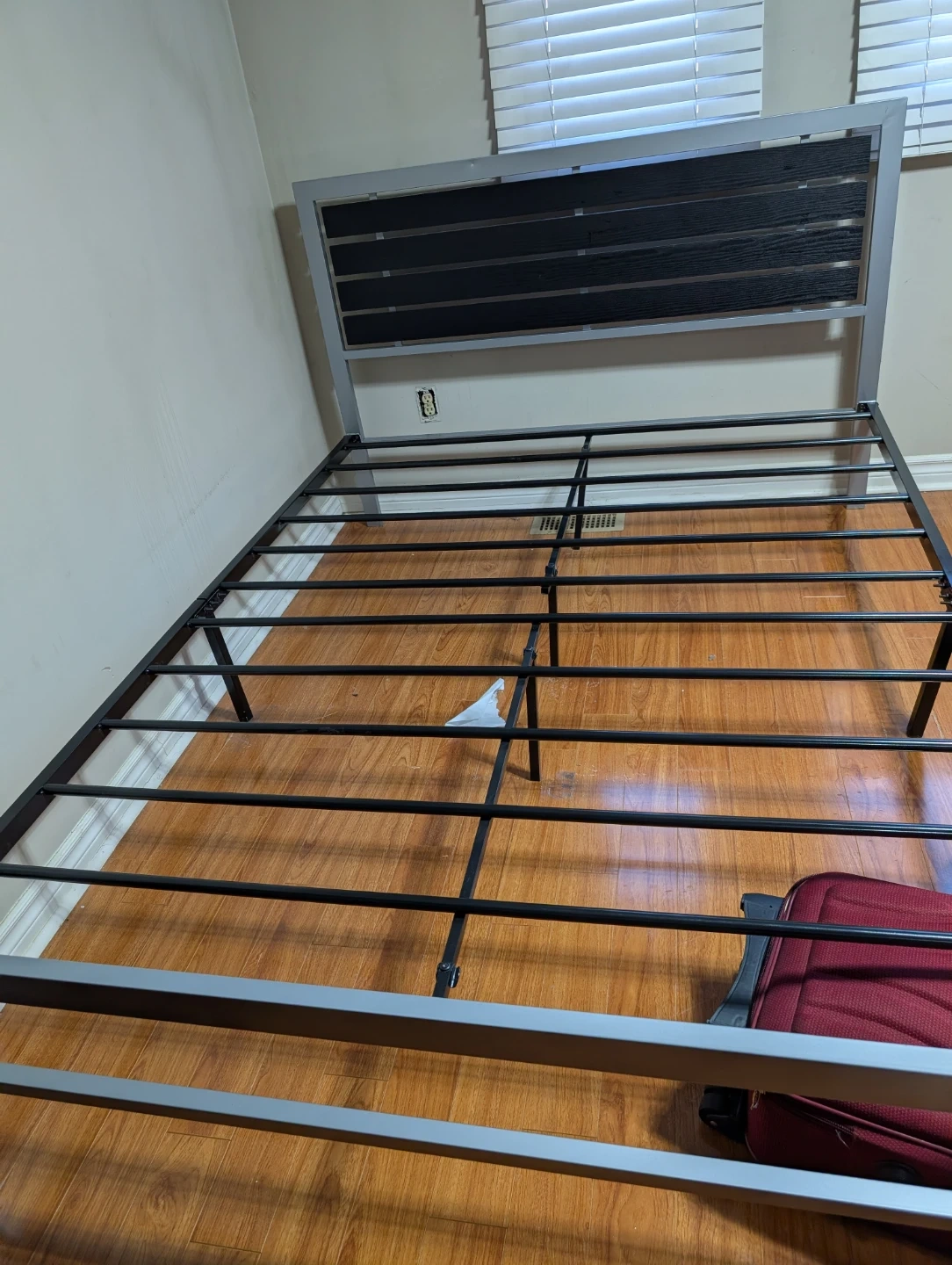 Metal bed frame with a modern headboard. Includes a queen-size mattress. Sturdy and comfortable for a good night's sleep!