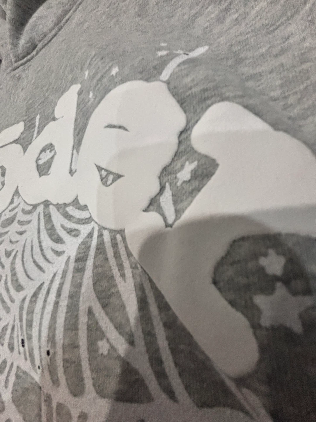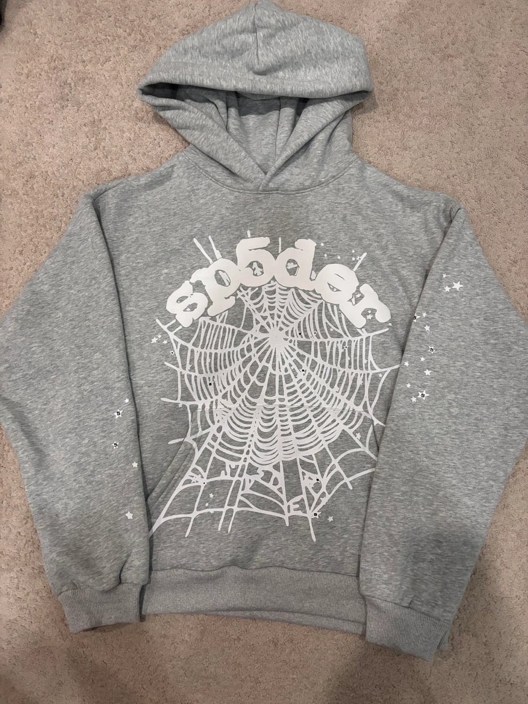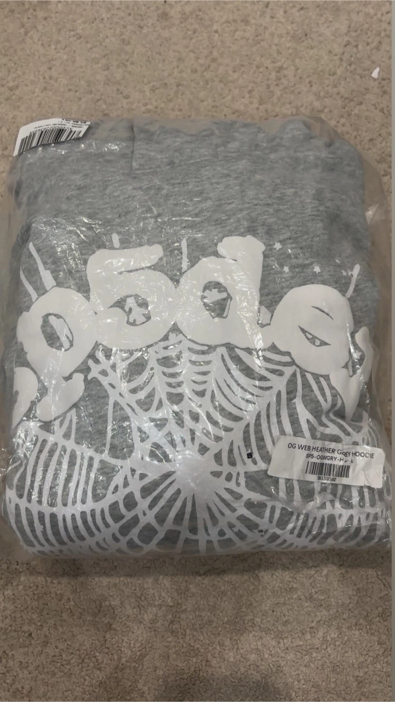 Selling a SP5DER OG Web Heather Grey Hoodie in size medium! It's in great condition and features a cool spider web design. Perfect for adding a unique touch to your wardrobe. DM for info
