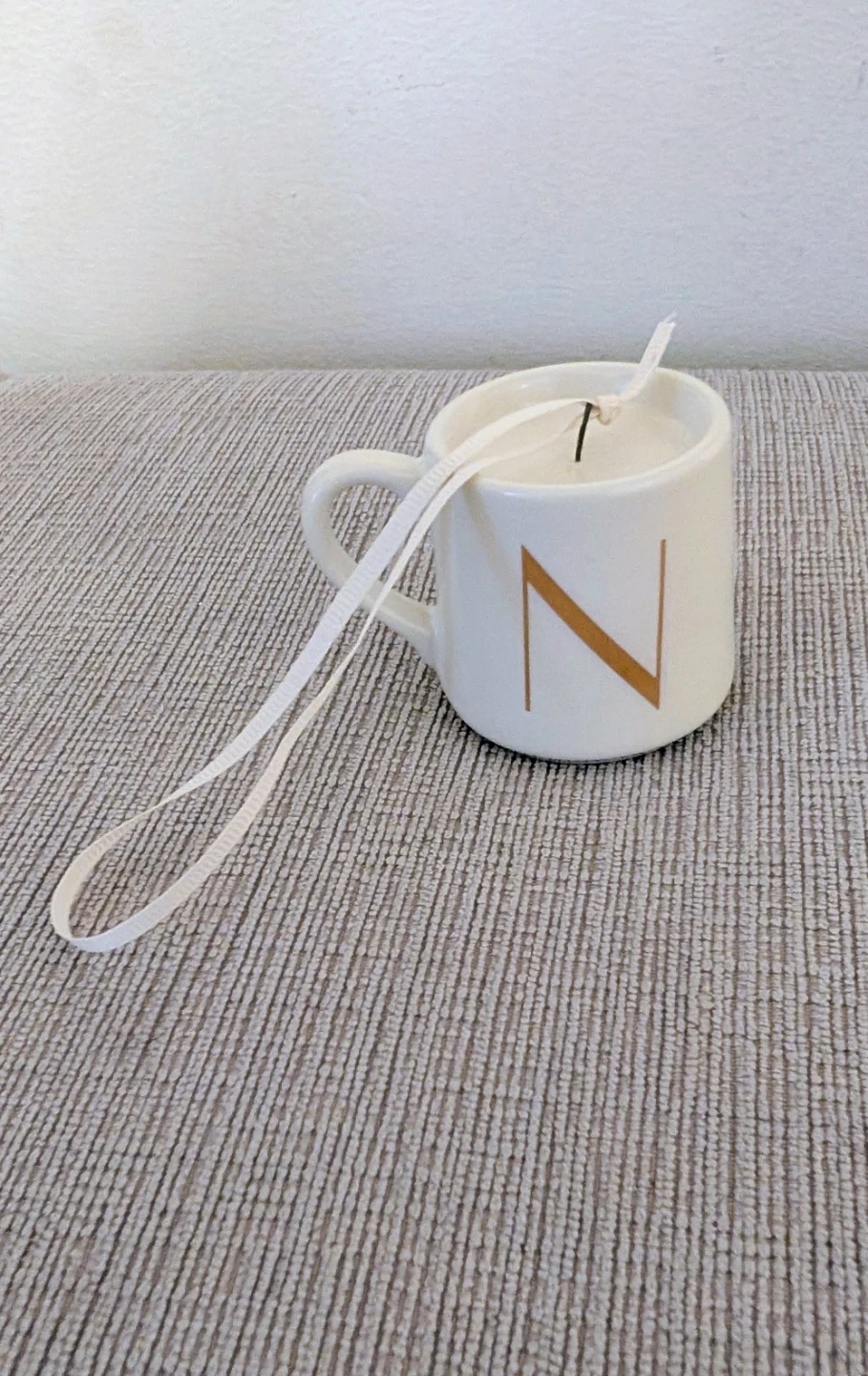 This is a white mug-shaped candle with a gold letter 'N' on the front. It has a white ribbon tied around the top. Measures approx. 3 inches tall and 3 inches in diameter. It's great for home decor or as a gift!