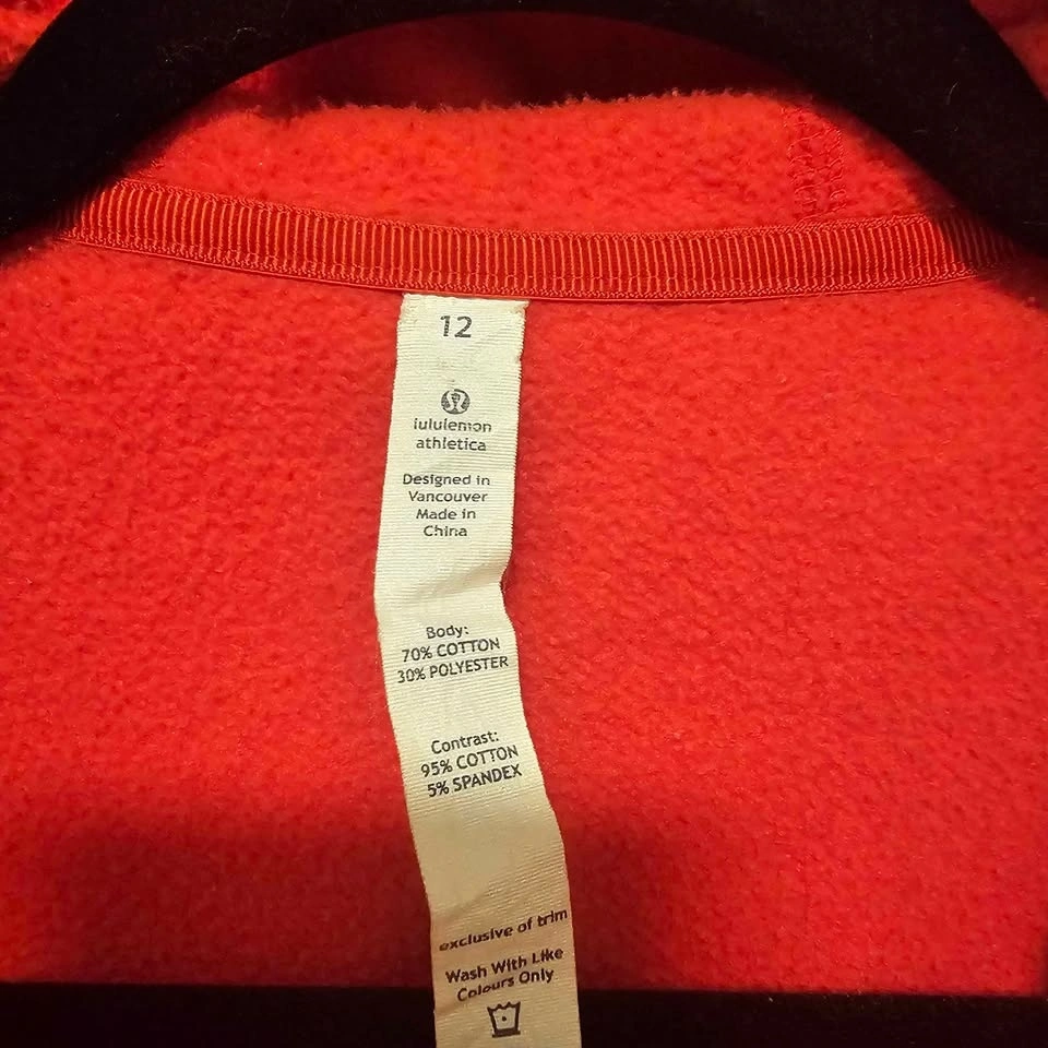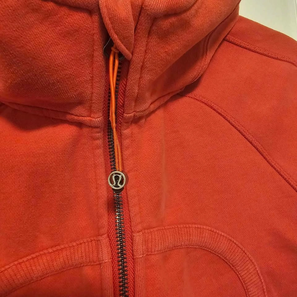 Lululemon Scuba hoodie in a beautiful coral/red shade. Size 12. Super cozy fleece interior with thumb holes and full zip. Classic, flattering fit. There are some small marks on one sleeve (shown in photos), but otherwise in great condition and tons of life left. Priced accordingly. Pickup in Langley.