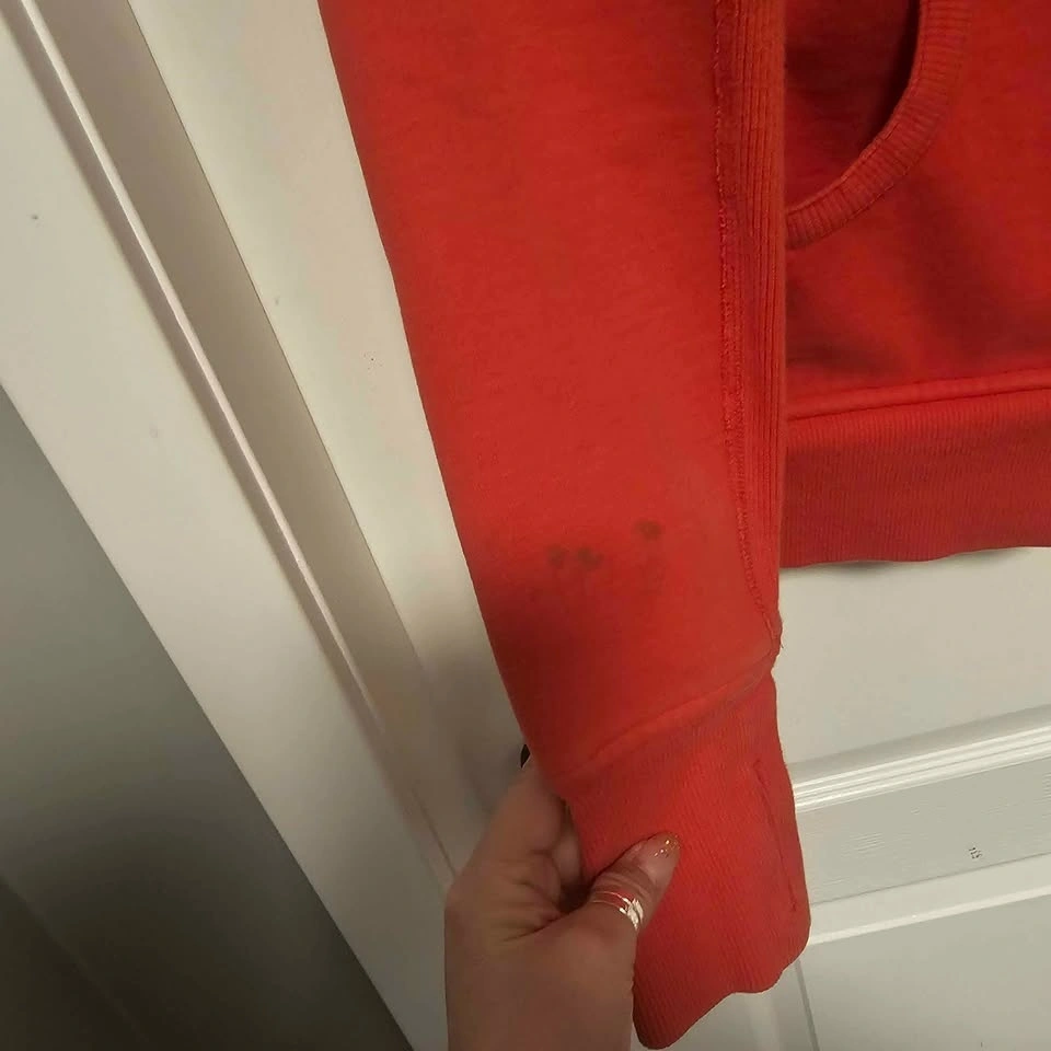 Lululemon Scuba hoodie in a beautiful coral/red shade. Size 12. Super cozy fleece interior with thumb holes and full zip. Classic, flattering fit. There are some small marks on one sleeve (shown in photos), but otherwise in great condition and tons of life left. Priced accordingly. Pickup in Langley.