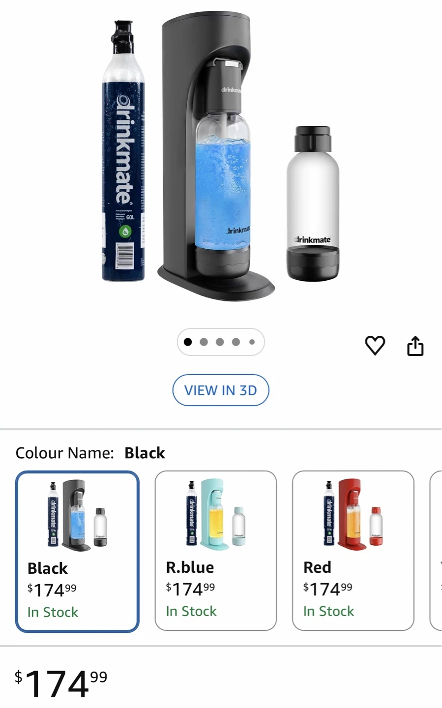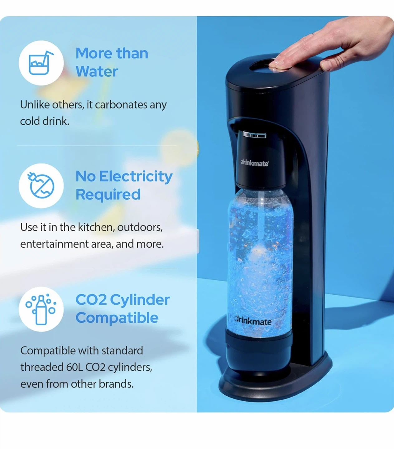 This is a Drinkmate soda maker in black. It lets you carbonate any cold drink, not just water! It requires no electricity and is compatible with standard threaded 60L CO2 cylinders.