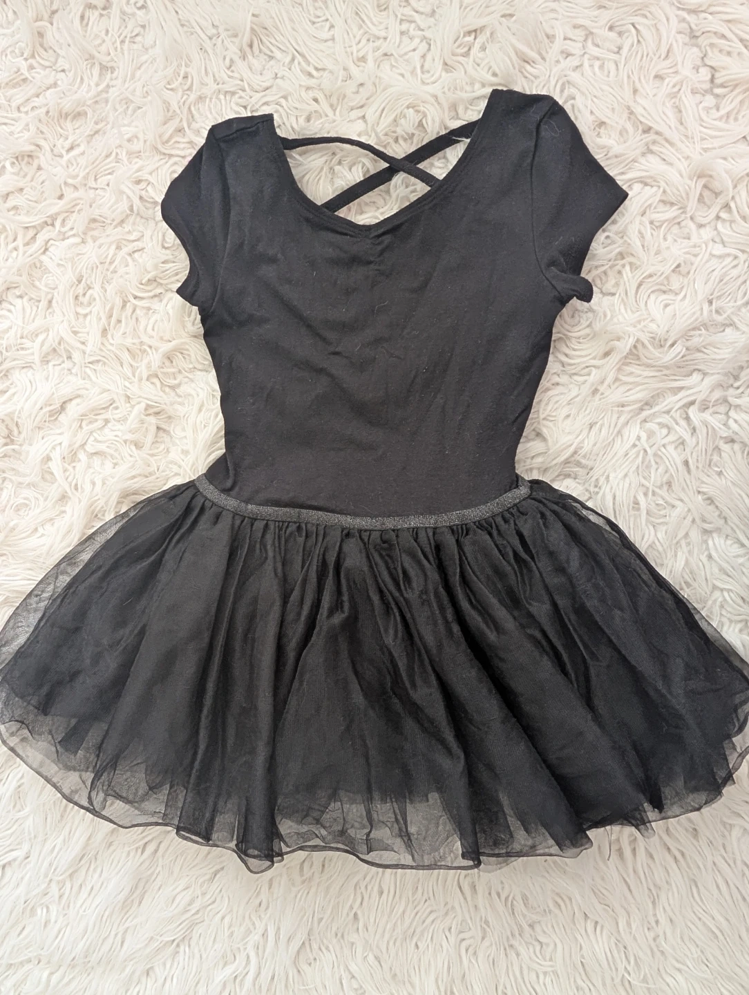 This is a black ballet tutu dress for kids. It features short sleeves and a layered tulle skirt. The criss-cross back design adds a cute touch.