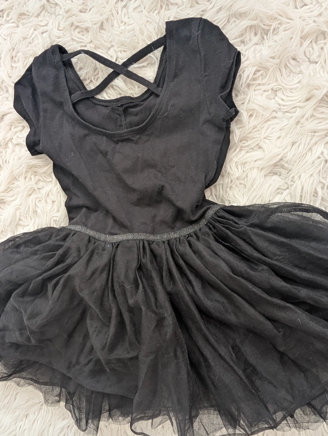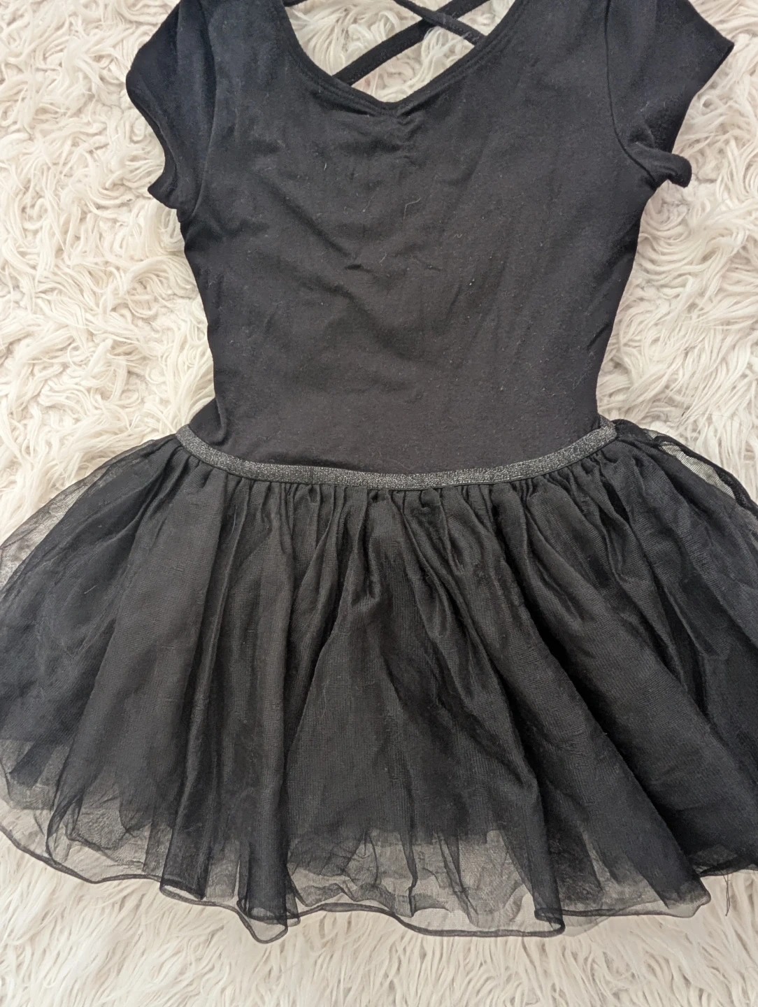 This is a black ballet tutu dress for kids. It features short sleeves and a layered tulle skirt. The criss-cross back design adds a cute touch.