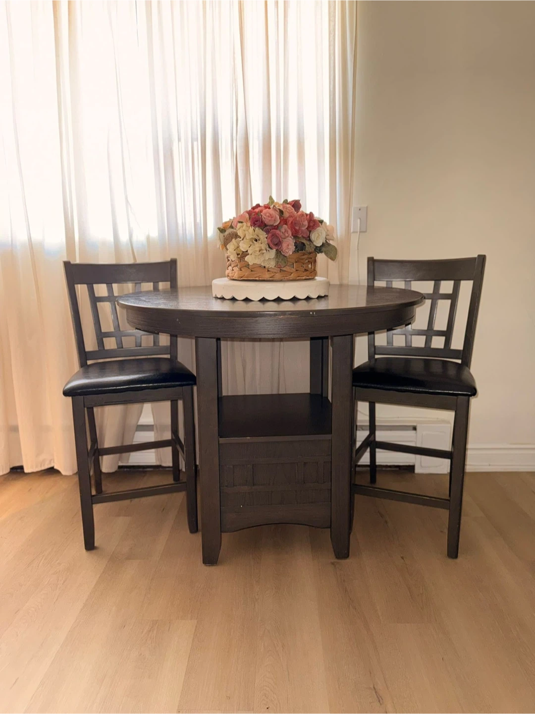 Dark brown round counter height dining table set. Includes two chairs with black upholstered seats. The table has a built-in shelf for storage. Perfect for small spaces!
