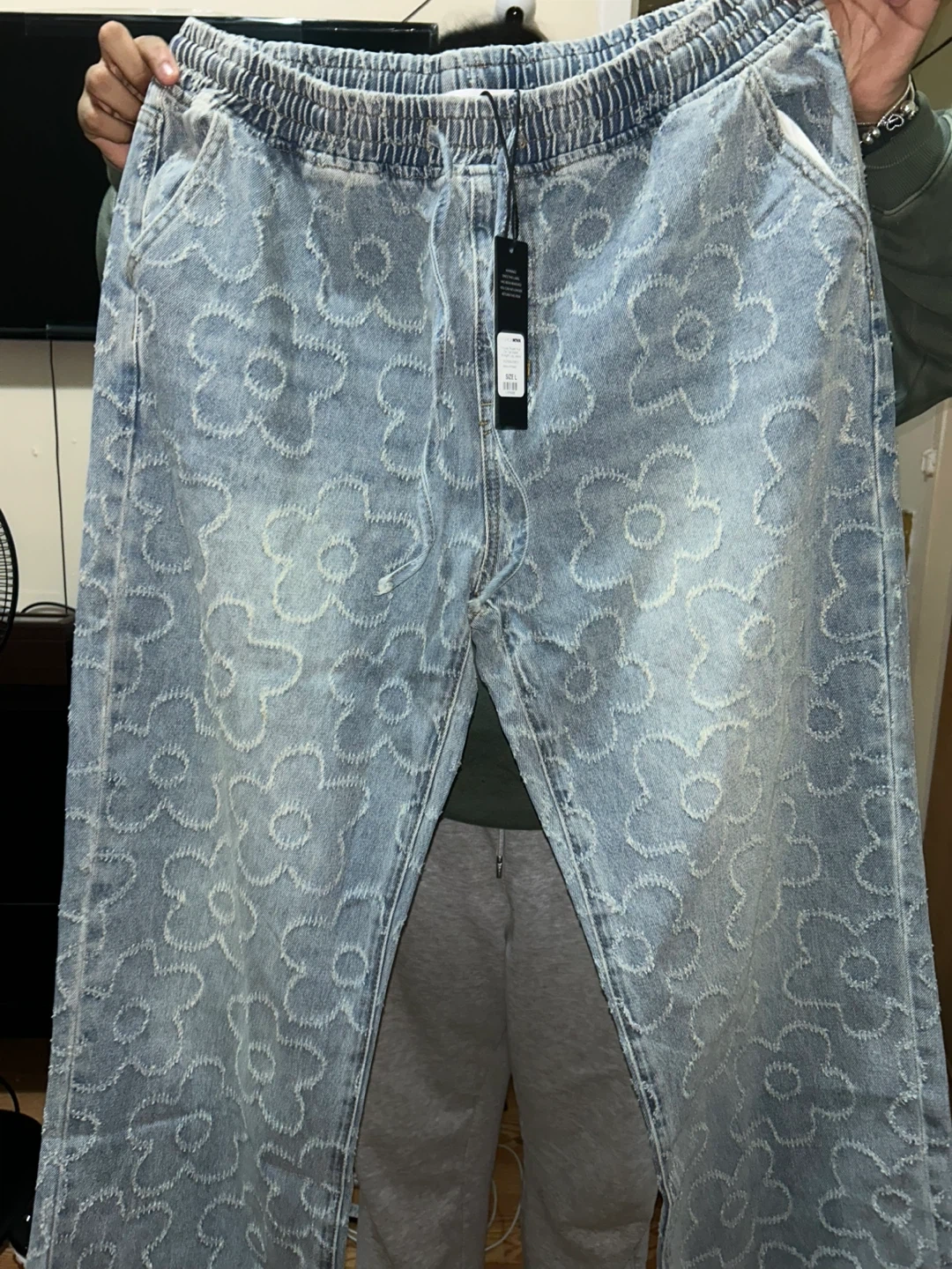 These light wash denim jeans feature an all-over embroidered floral pattern. They have a comfortable elastic waistband with a drawstring. The fit is wide leg.