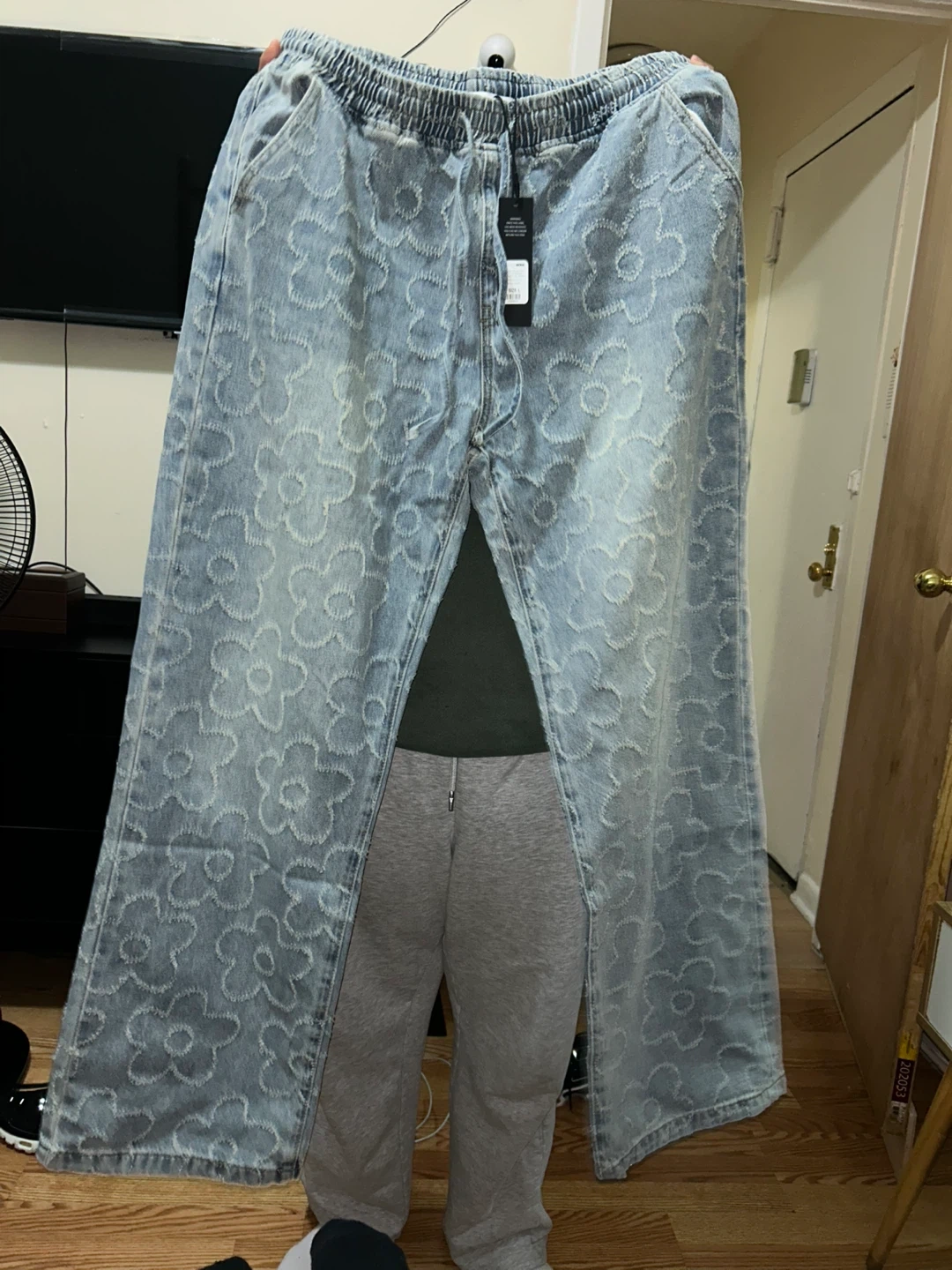 These light wash denim jeans feature an all-over embroidered floral pattern. They have a comfortable elastic waistband with a drawstring. The fit is wide leg.