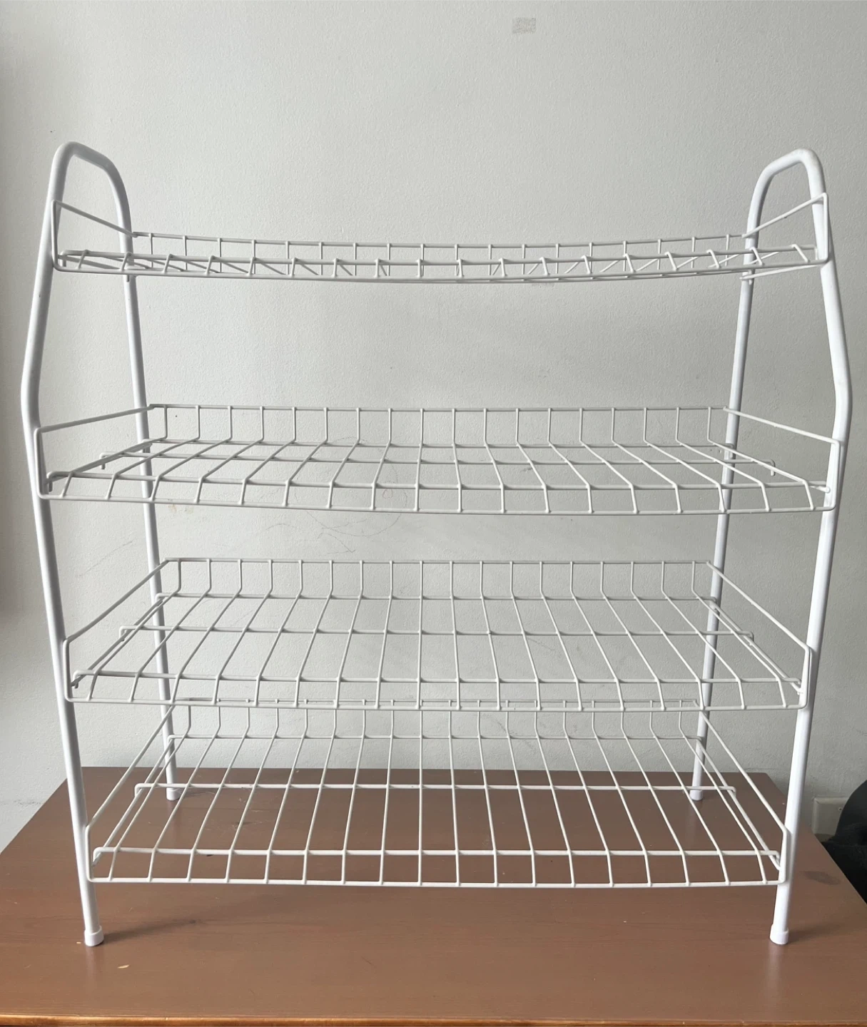 A white wire shelving rack with three tiers. It's made of metal and offers plenty of storage space. This rack is great for organizing footwear. It's lightweight and easy to move!