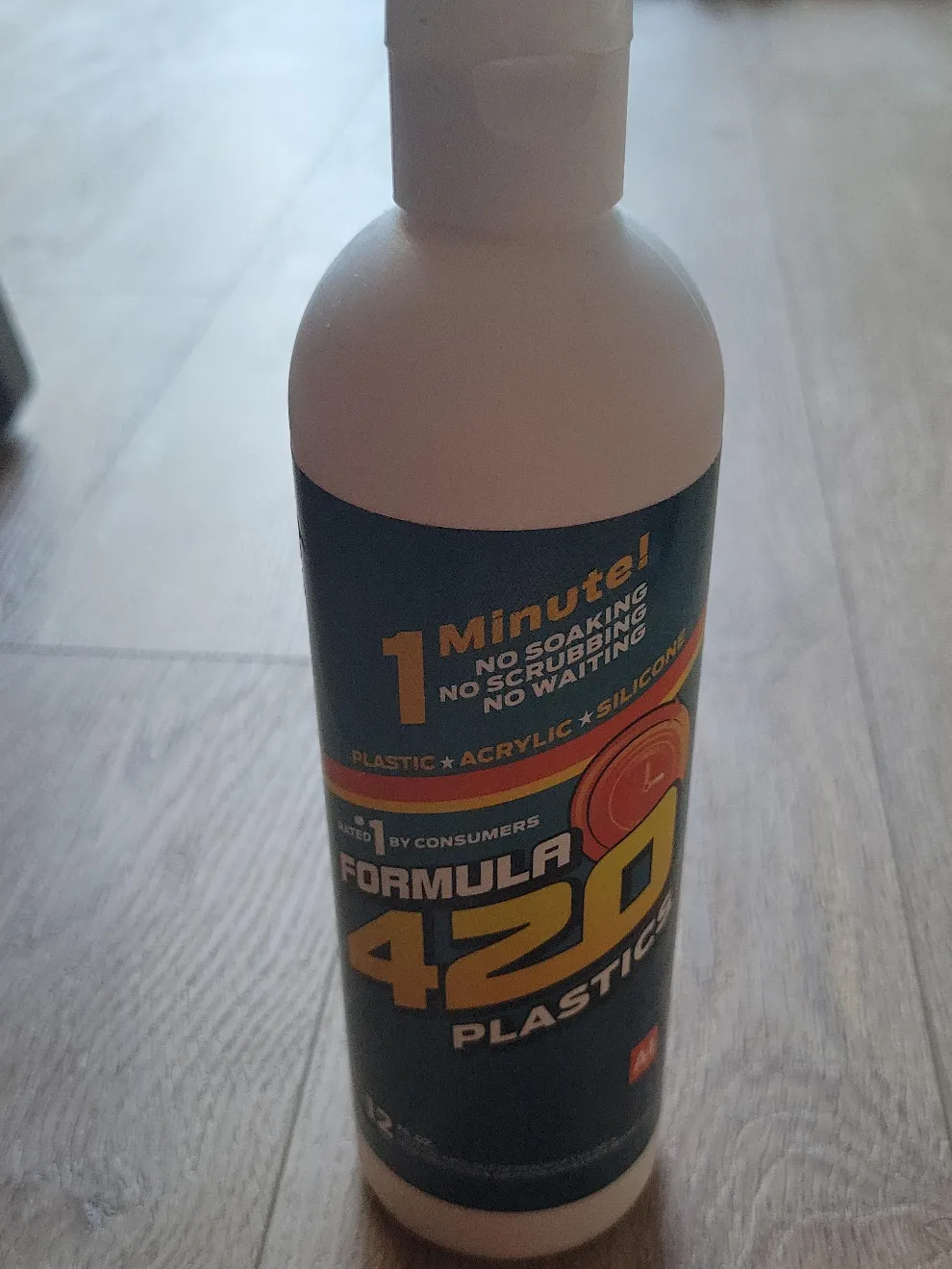 Selling a bottle of Formula 420 Plastics cleaner. It's designed for cleaning plastic, acrylic, and silicone items. It works in just 1 minute with no soaking or scrubbing needed