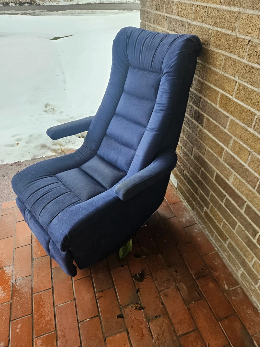 Comfortable blue fabric recliner chair. It has padded armrests and a channel-tufted back. This chair would be useful for relaxing after a long day.