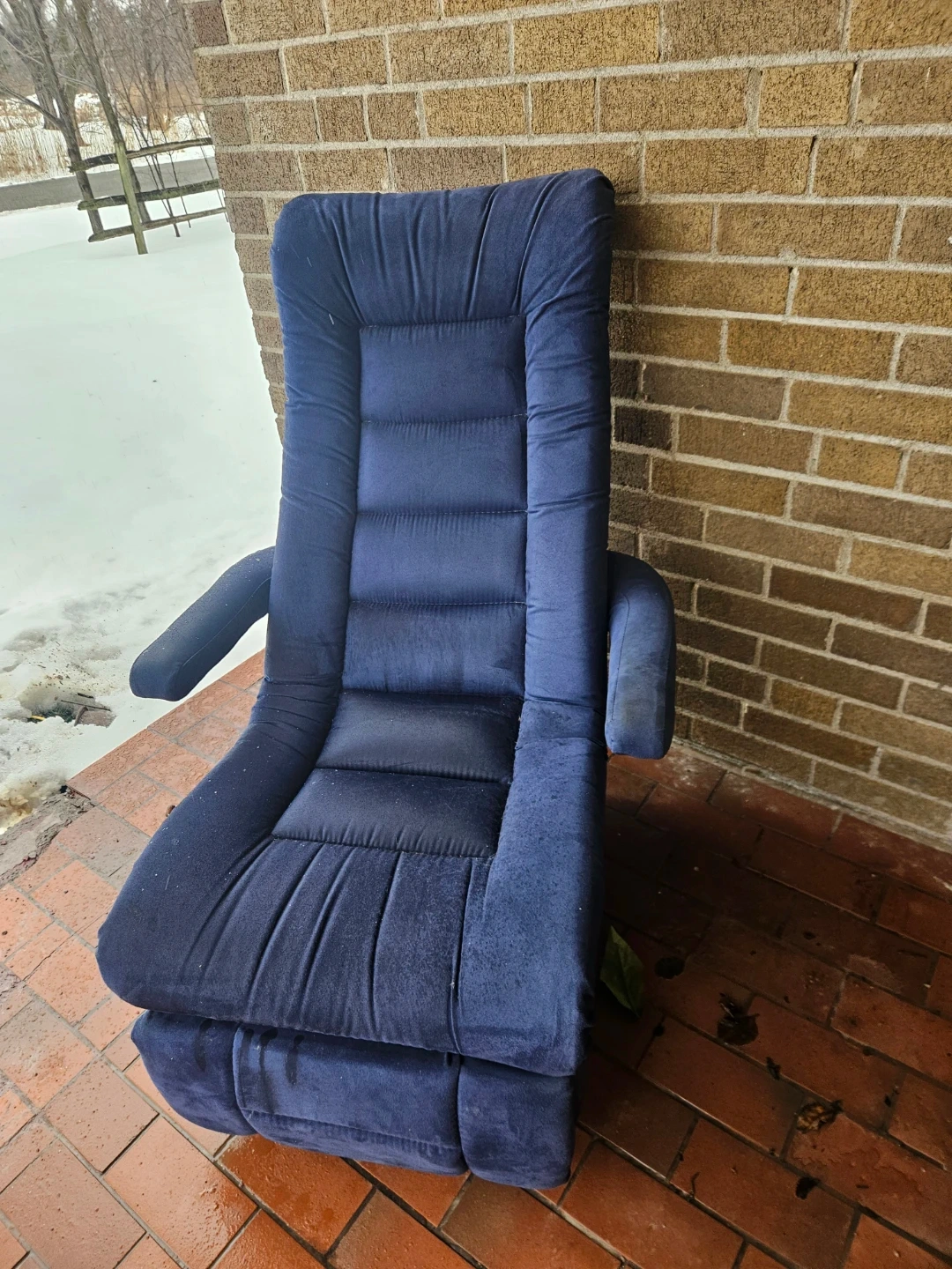 Comfortable blue fabric recliner chair. It has padded armrests and a channel-tufted back. This chair would be useful for relaxing after a long day.