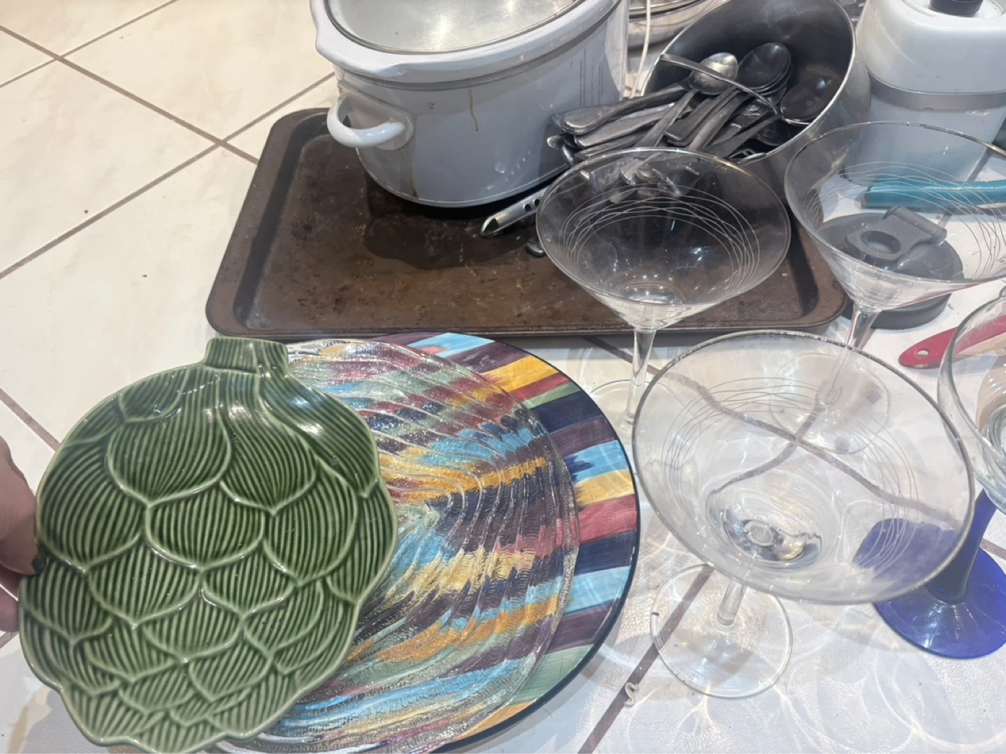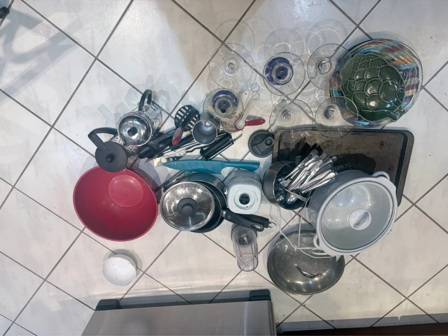 Assorted kitchen items including pots, pans, various glasses, and a collection of utensils. Some items are decorative, like the green artichoke dish. This lot is great for stocking a new kitchen or replacing worn-out pieces.
