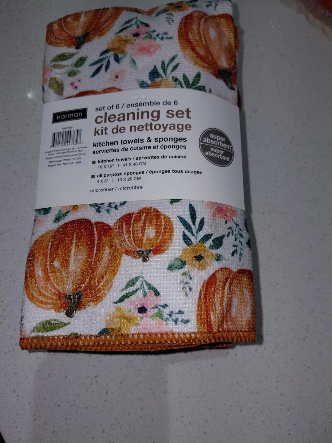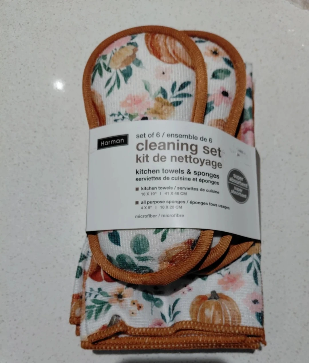 This set comes with 3 kitchen towels measuring 16 x 19 inches and 3 all-purpose sponges measuring 4 x 8 inches. All items are made with microfiber. Brand New