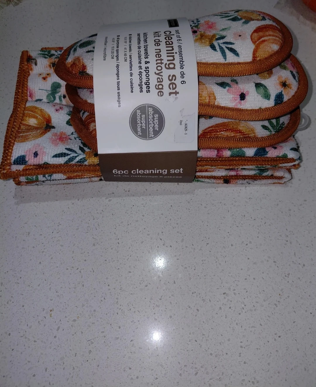 This set comes with 3 kitchen towels measuring 16 x 19 inches and 3 all-purpose sponges measuring 4 x 8 inches. All items are made with microfiber. Brand New
