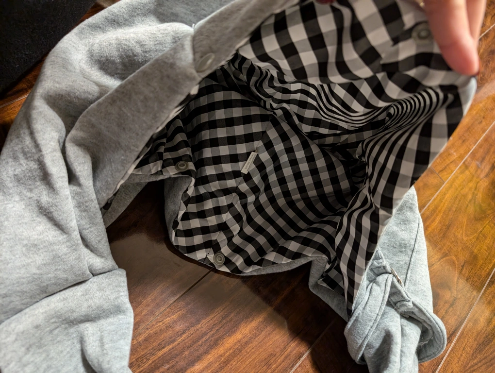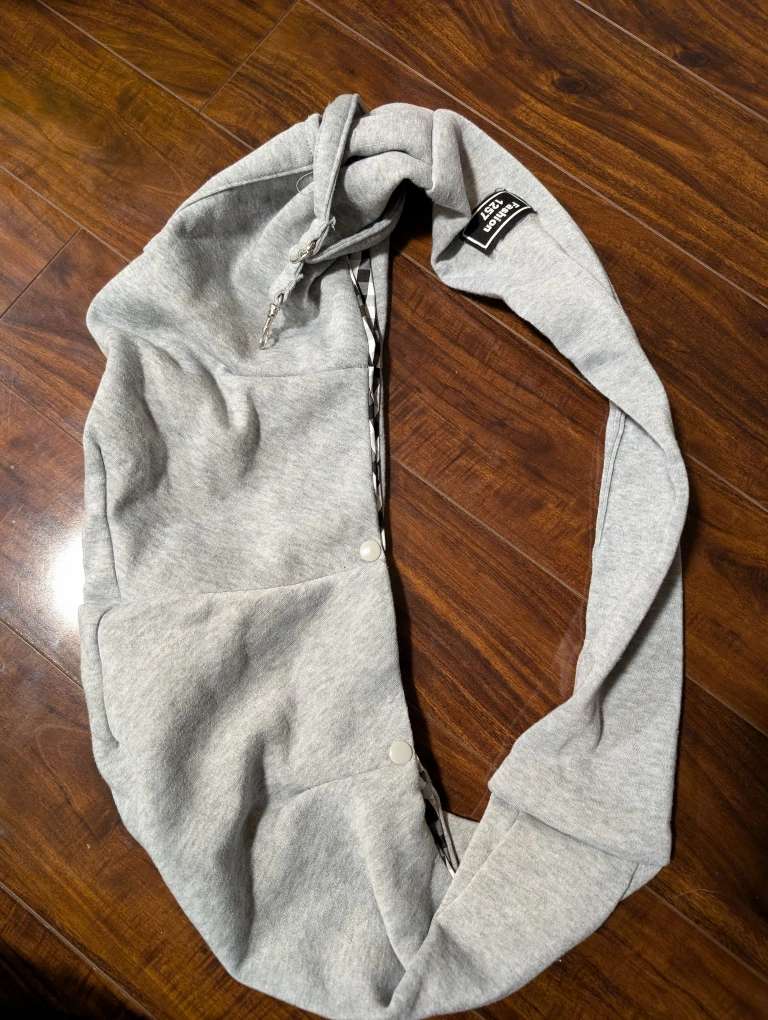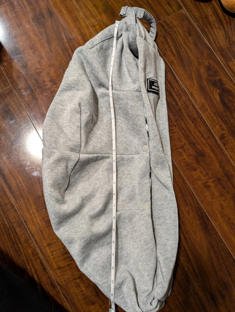Grey hoodie snuggie with black and white checkered lining. Has a few buttons on the side and measures approximately 26 inches long. I used it when my dog was still very small and snuggled him inside during trips.