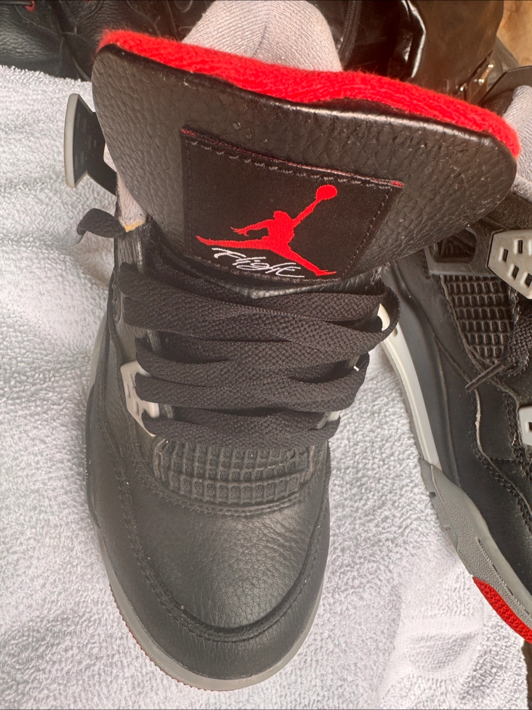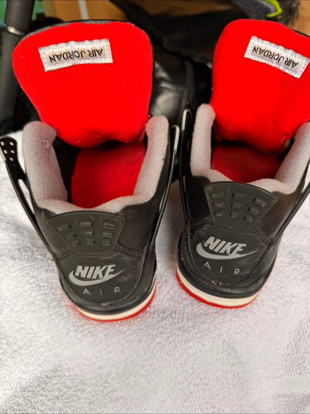 Selling a pair of Air Jordan 4 Retro sneakers in black and red. They show some signs of wear but still have lots of life left in them!