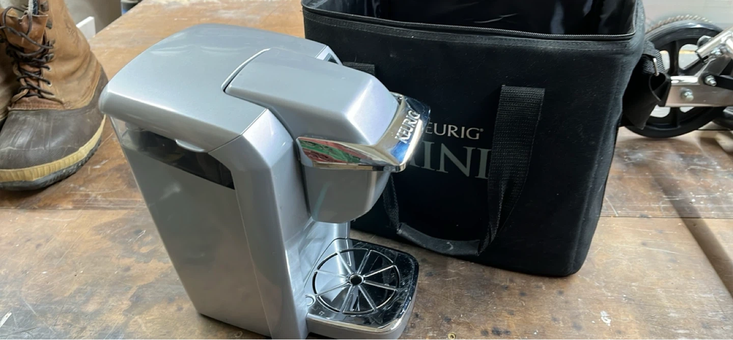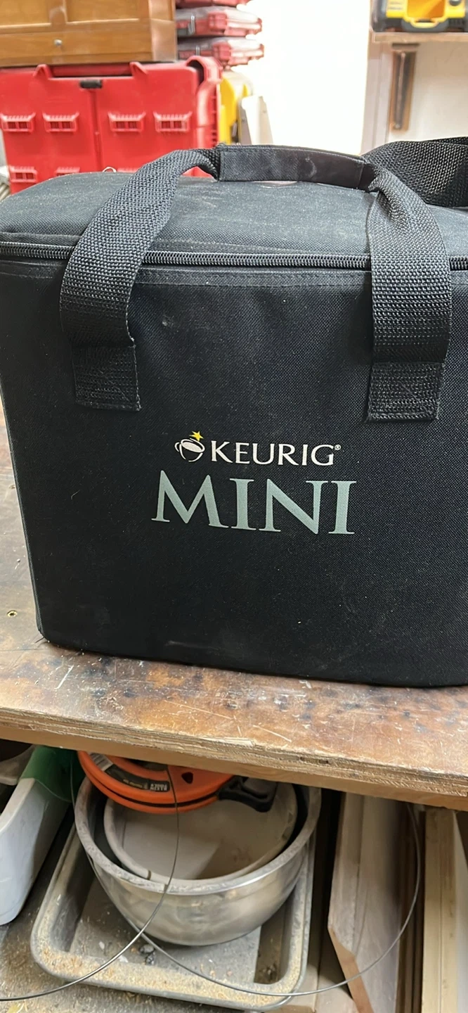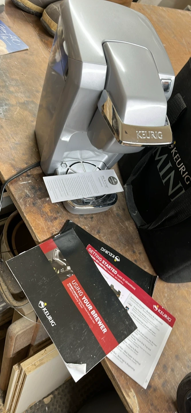 This Keurig Mini Plus coffee brewer is silver and comes with its original carrying bag and manuals. It's compact for easy storage and use.