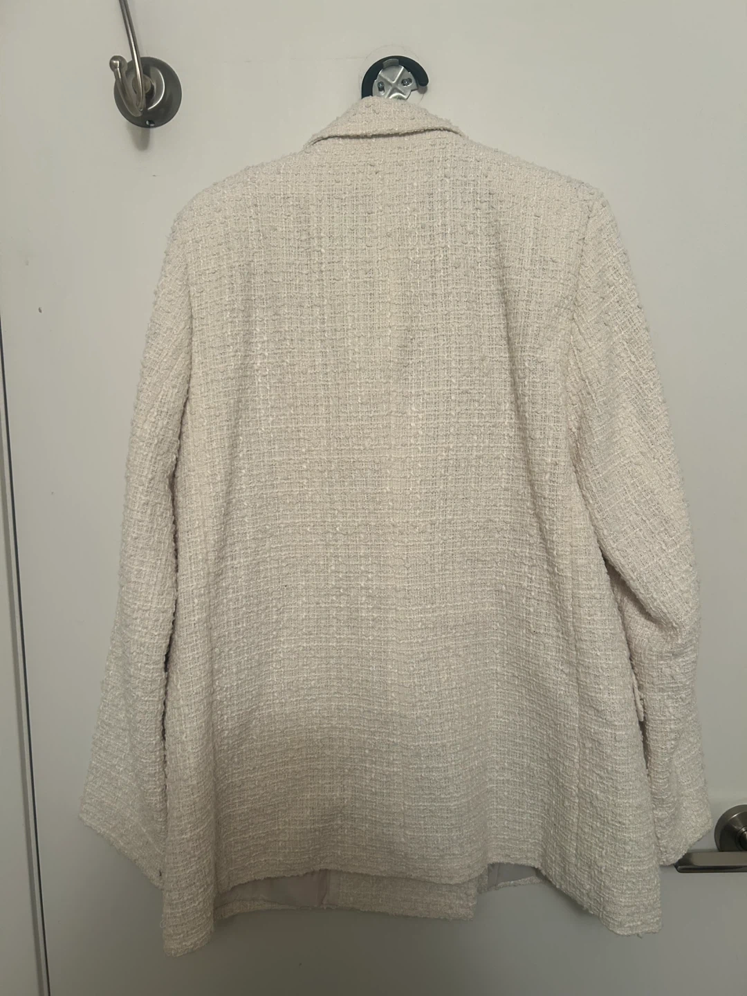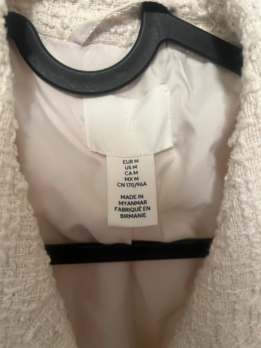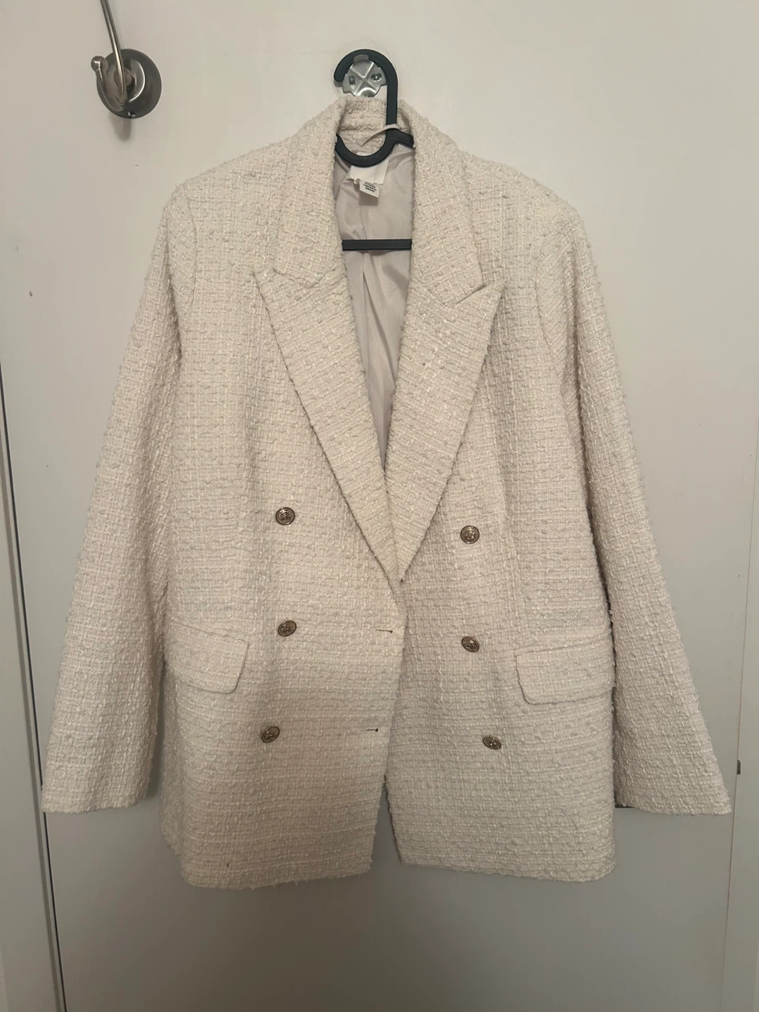 This is an H&M cream tweed blazer jacket. It's a double-breasted style with gold-toned buttons. Size is medium but it’s oversized. When worn photo on the last slide.
