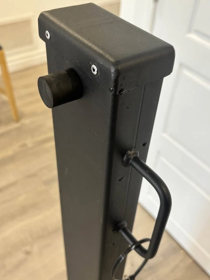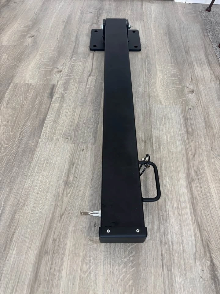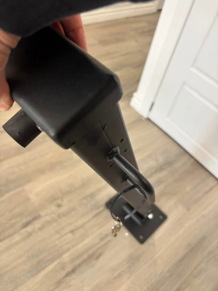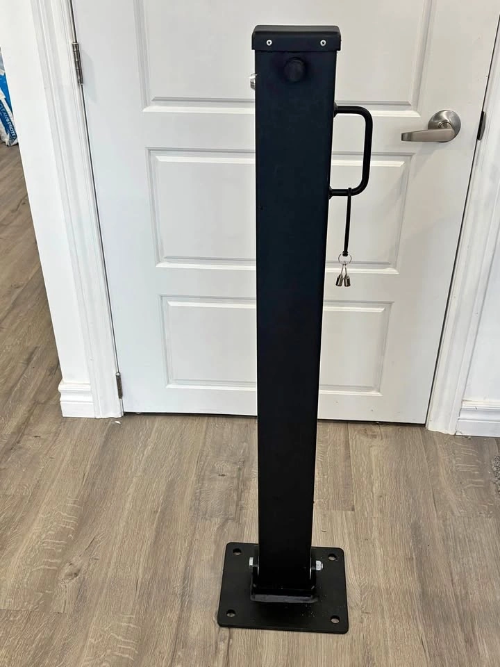 ONE LEFT - CDN made security post. Park your trailer or boat up against the side of your house and secure the post to the driveway. Insert the unique key to lower the post, then lock when upright. It allows you to move your trailer or boat in and out without worrying about someone trying to take it away. Canadian A500 - 21 GR B/C cold formed welded & seamless carbon steel, powder coated in Ontario. 51x102 mm (2"x4") post with a 3.2 mm thick wall for strong security. 1.1 metres high (41") to protect trailers/boats. Bolt into asphalt or pad.